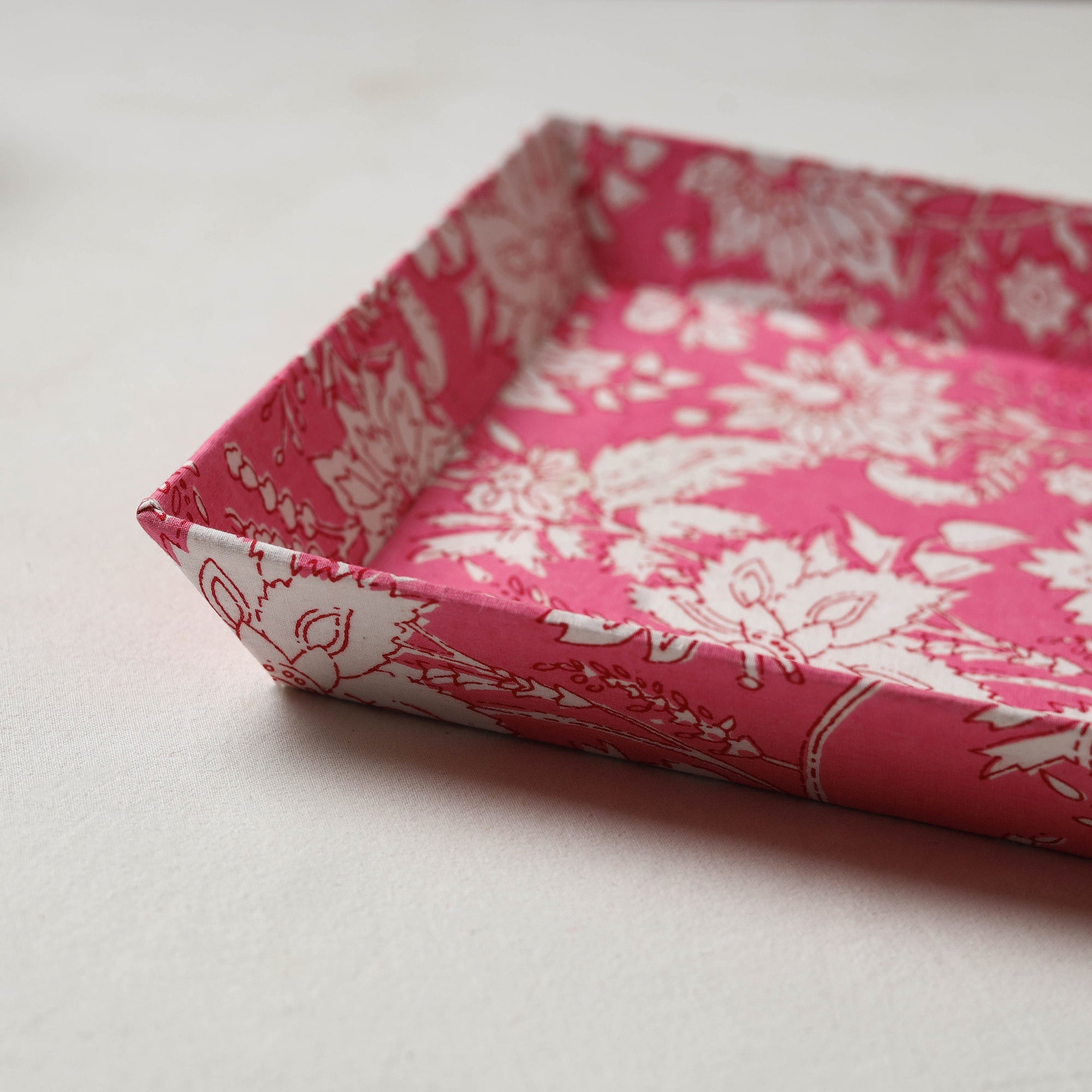 This handcrafted pink valet tray has cotton fabric on top and strong cardboard inside. It’s perfect for keeping keys, coins, jewelry, or small desk items in one place. You can also use it for decoration. Its lovely print adds a nice touch to your table, bedside, or entryway.