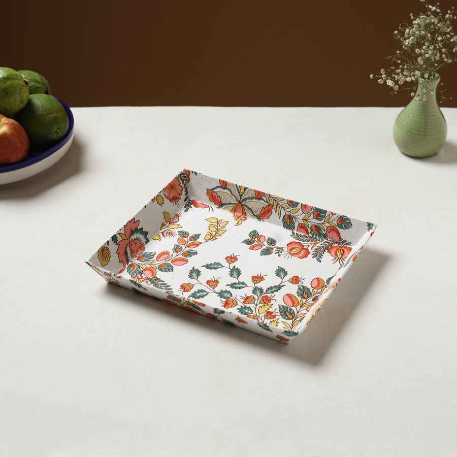This handcrafted white valet tray has cotton fabric on top and strong cardboard inside. It’s perfect for keeping keys, coins, jewelry, or small desk items in one place. You can also use it for decoration. Its lovely print adds a nice touch to your table, bedside, or entryway.