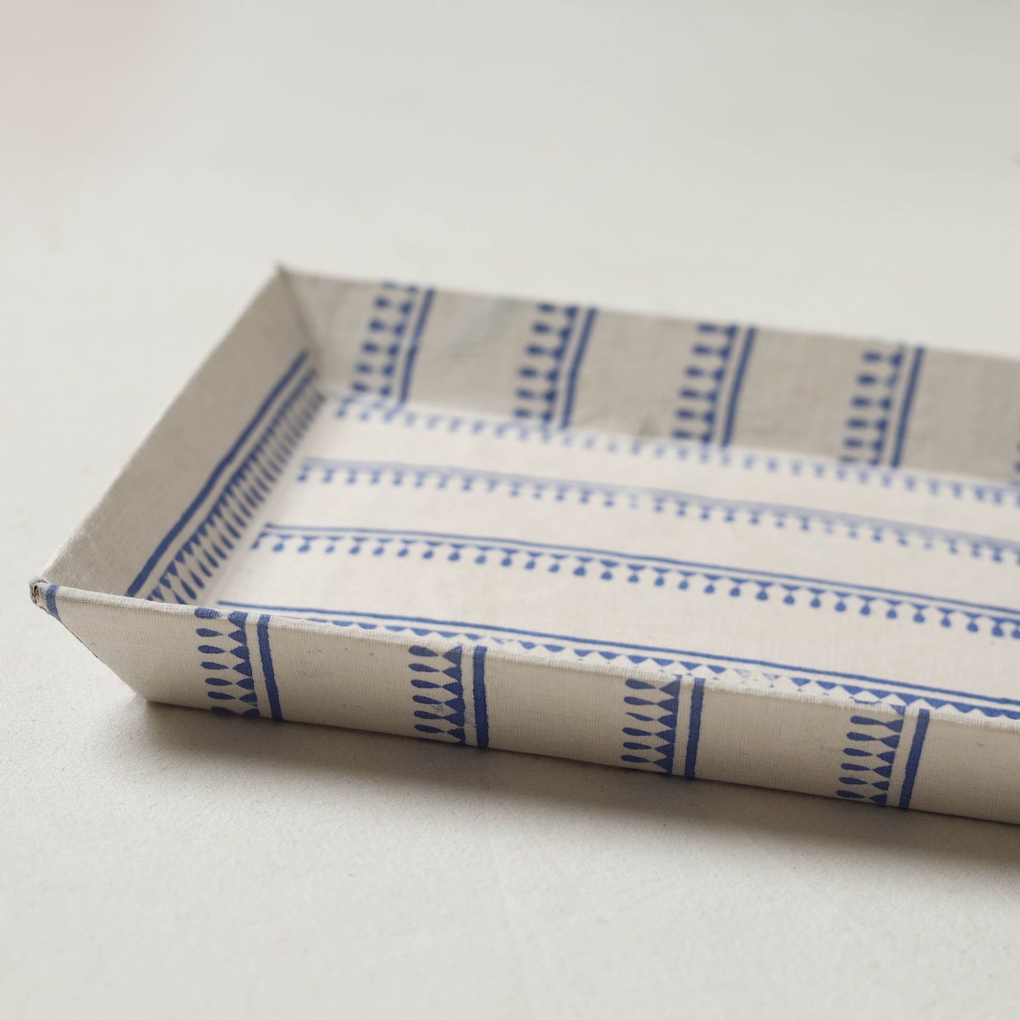 This handcrafted white valet tray has cotton fabric on top and strong cardboard inside. It’s perfect for keeping keys, coins, jewelry, or small desk items in one place. You can also use it for decoration. Its lovely print adds a nice touch to your table, bedside, or entryway.