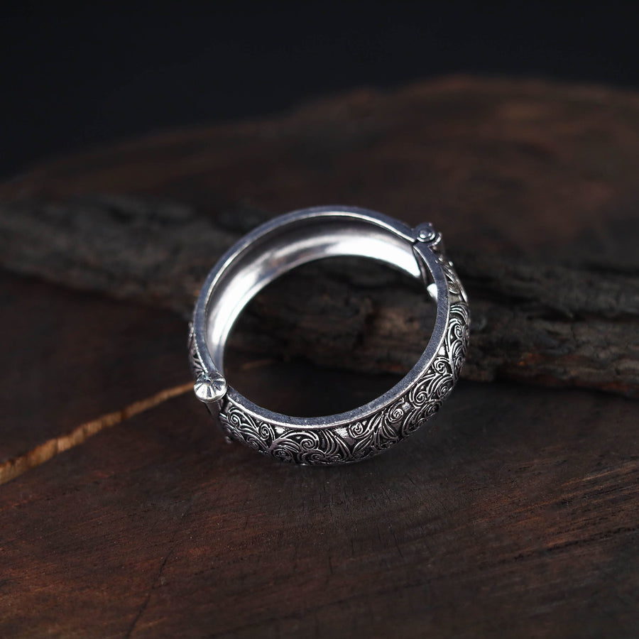 This german silver-plated handcrafted bracelet/bangle showcases intricate oxidised detailing and a timeless antique finish. With its elegant yet durable design, it pairs effortlessly with festive Indian wear as well as everyday fusion looks. A graceful blend of tradition and modern charm, it also makes for a thoughtful gift to celebrate special moments.