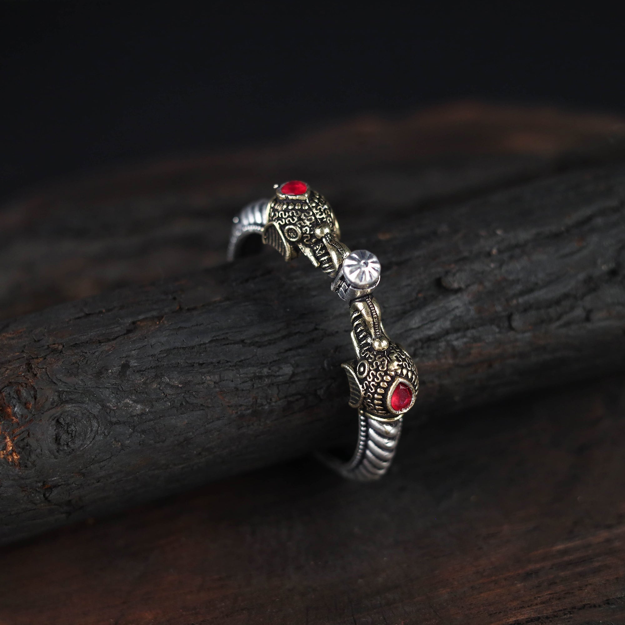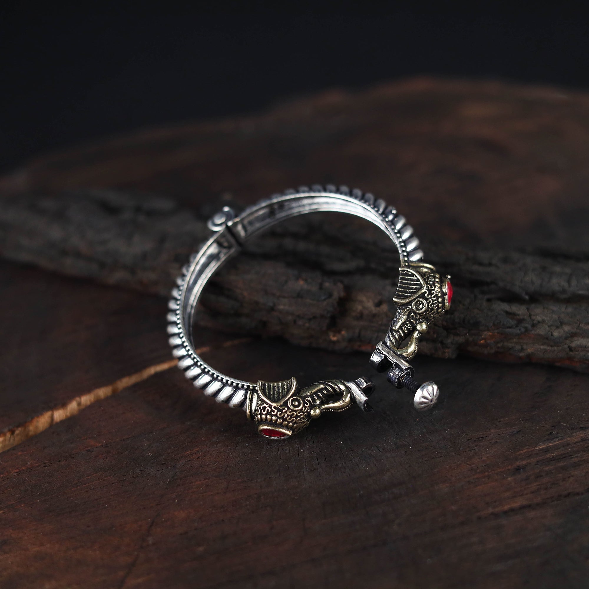 This german silver-plated handcrafted bracelet/kada features intricate oxidised detailing and a timeless antique finish. With its elegant yet durable design, it pairs beautifully with festive Indian attire and everyday fusion looks. A graceful fusion of tradition and modernity, it also makes a thoughtful gift for special occasions.