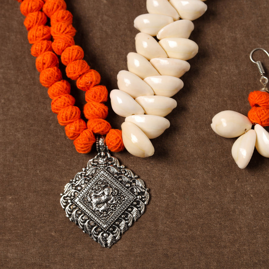 Multicolor handcrafted german silver shell necklace set is perfect for enhancing your look. German silver, known for its durability and shiny finish. This necklace, featuring intricate shell and thread work beads, adds a touch of traditional charm to your ensemble.