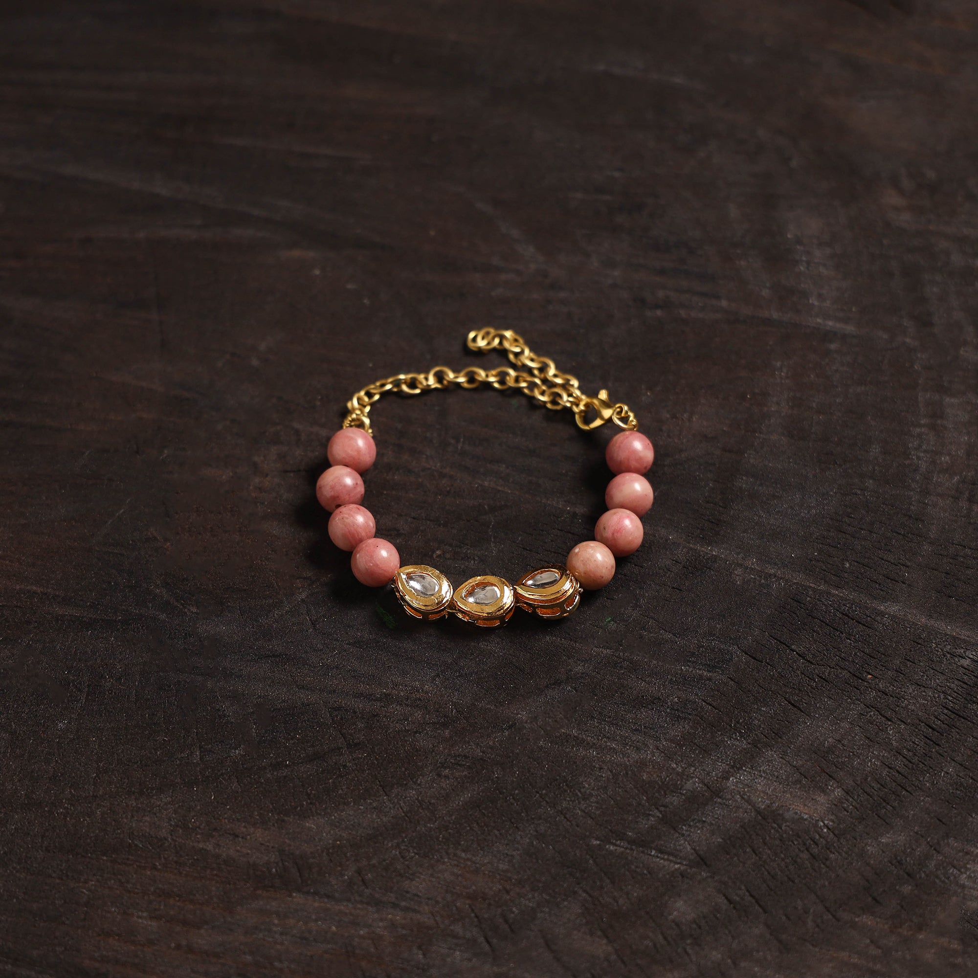 | Material | A handcrafted pink bracelet featuring carefully set glass stones and kundan, adding a bright, artisanal touch to your look. Pair it with everyday outfits or festive wear, this piece works well as a simple style upgrade or a thoughtful gift. |