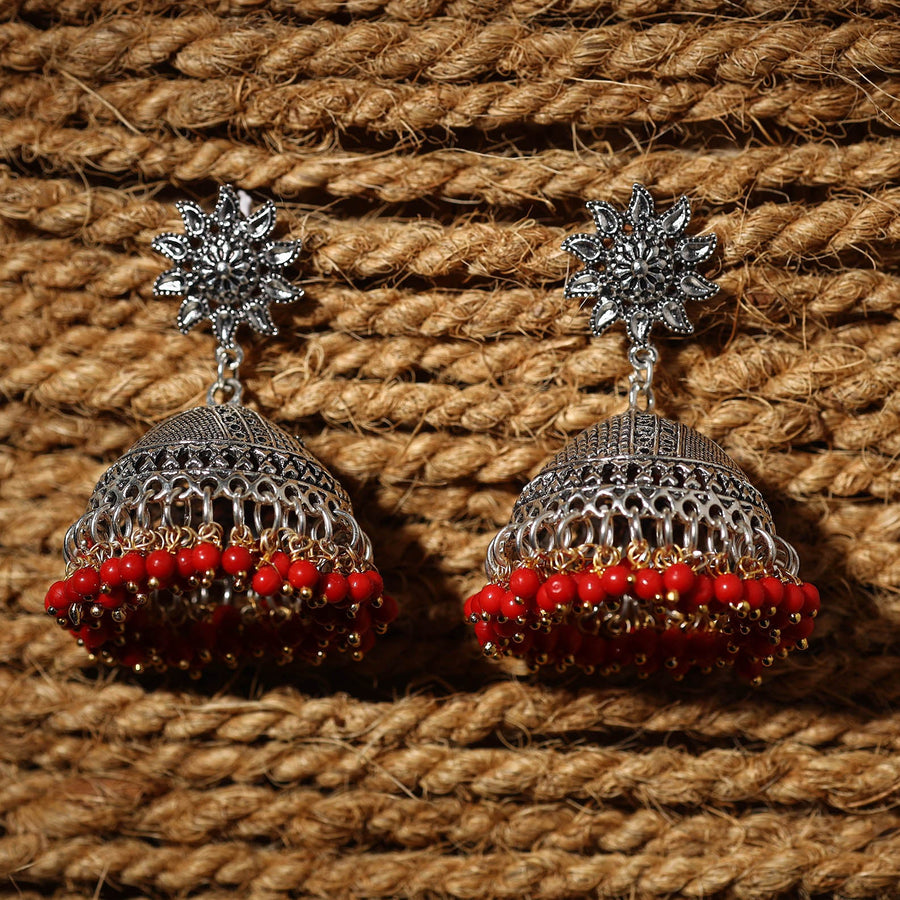 Grey handcrafted gs beaded jhumki earrings. Crafted from oxidised german silver adorned with intricate bead work. Perfect for casual outings or festive celebrations they make a versatile addition to any jewelry collection.