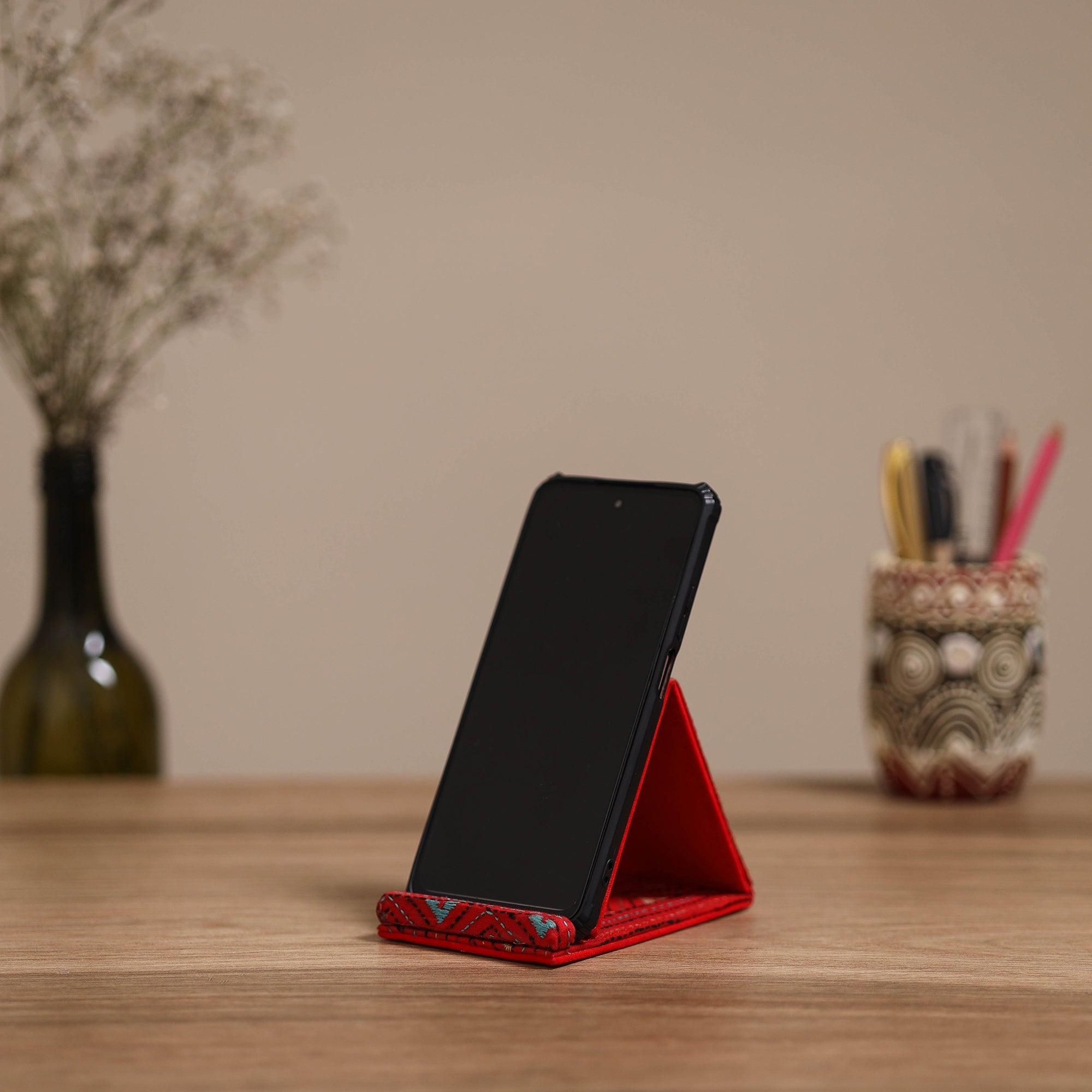 Kantha hand embroidered mobile stand is thoughtfully created on a sturdy hard board and beautifully finished with contemporary patterns. Carefully made by skilled artisans from West Bengal, it reflects the charm of traditional kantha embroidery passed down through generations. Lightweight and easy to carry, this mobile stand is perfect for travel or daily use.