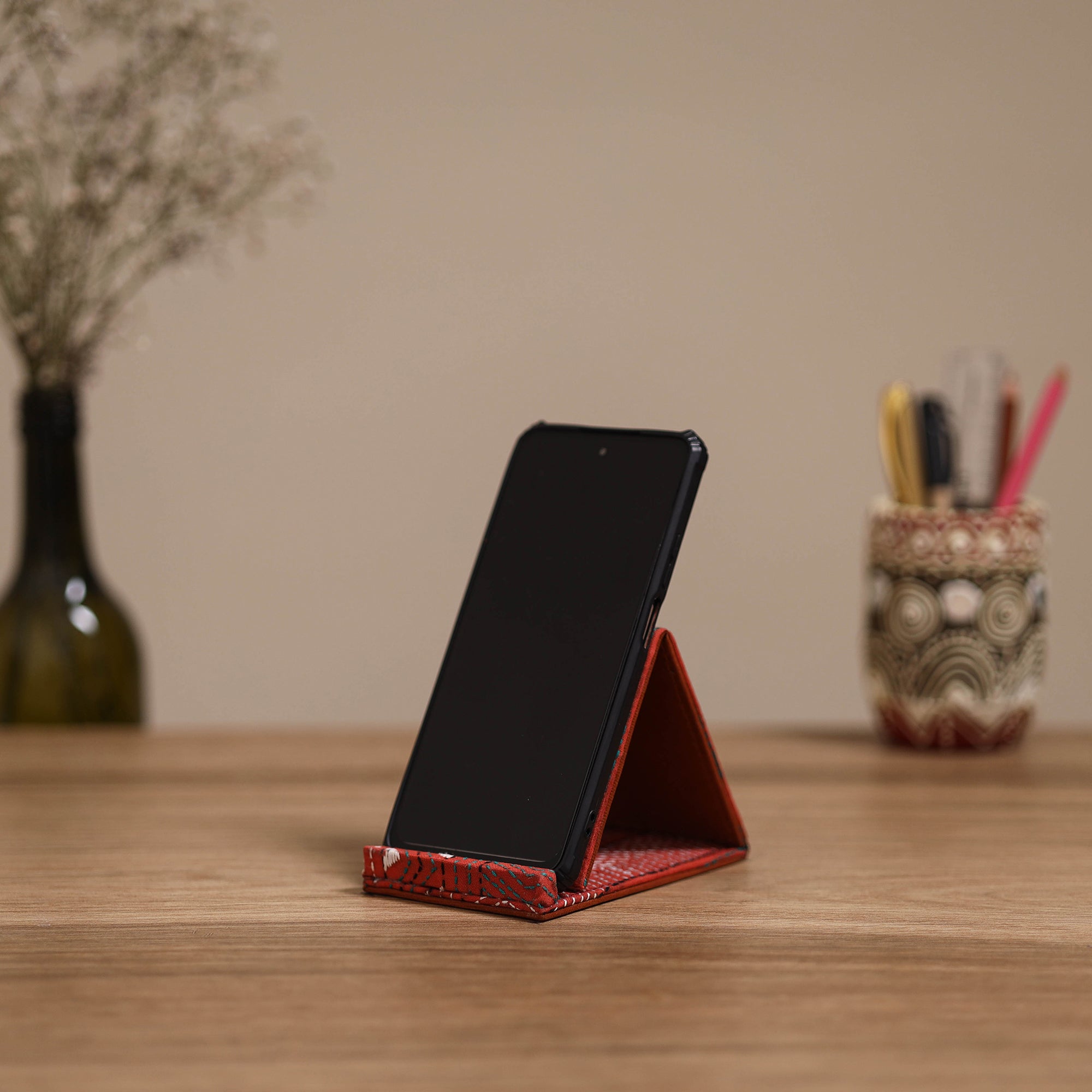 Kantha hand embroidered mobile stand is thoughtfully created on a sturdy hard board and beautifully finished with contemporary patterns. Carefully made by skilled artisans from West Bengal, it reflects the charm of traditional kantha embroidery passed down through generations. Lightweight and easy to carry, this mobile stand is perfect for travel or daily use.