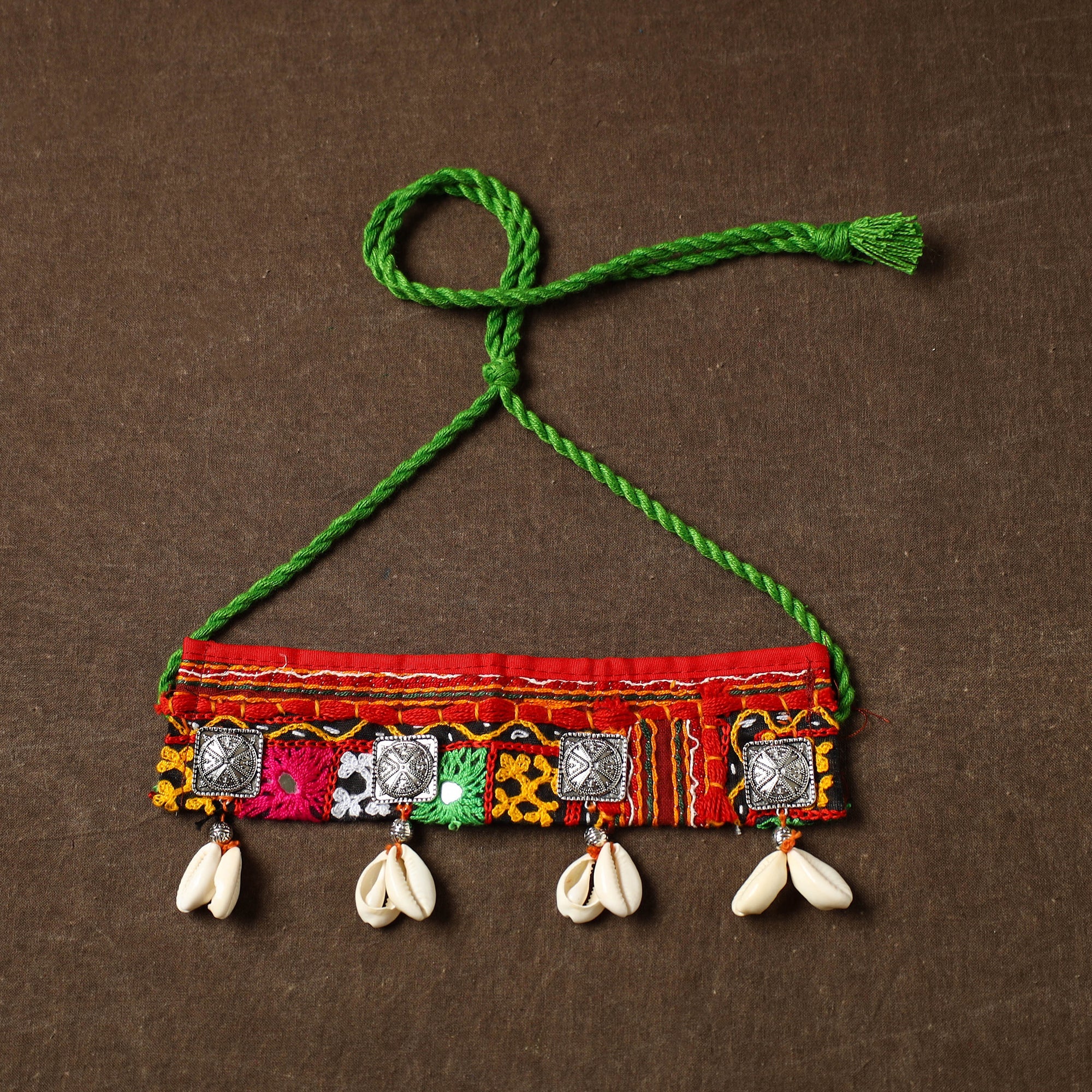 Add a touch of tradition to your wardrobe with this red handcrafted kutch embroidered shell work choker necklace, featuring shell work. The necklace comes, making it a perfect set for festive occasions or casual outings. The delicate embroidery reflects the rich cultural heritage of Kutch, offering both elegance and a sense of authenticity.