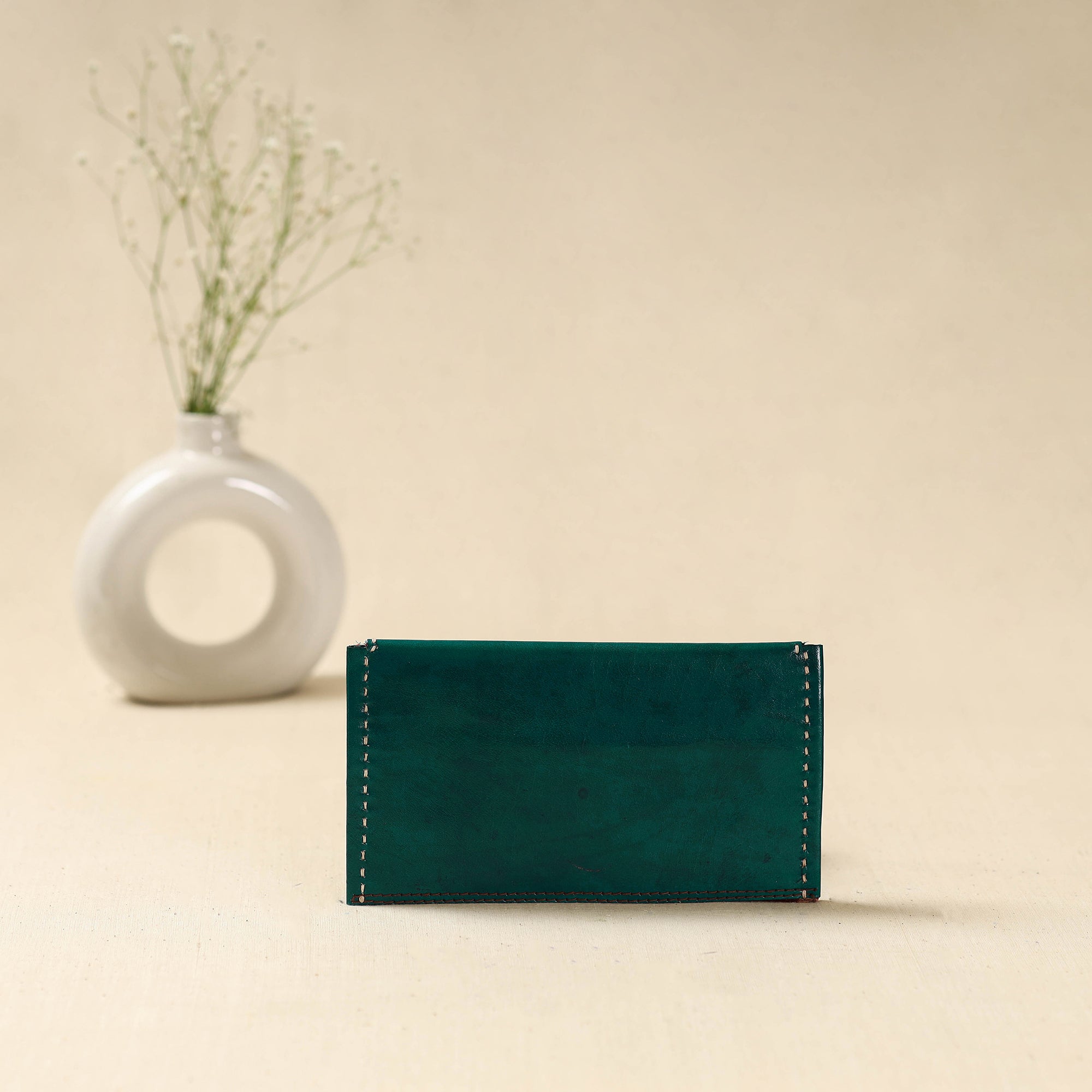 Handcrafted green kutch embroidery leather clutch wallet is made using ajrakh block-printed mashru silk fabric and leather, crafted by skilled artisans from the Kutch region of Gujarat. Designed for everyday convenience, it features two inner partitions that help keep your cash, cards and essentials neatly organised.
