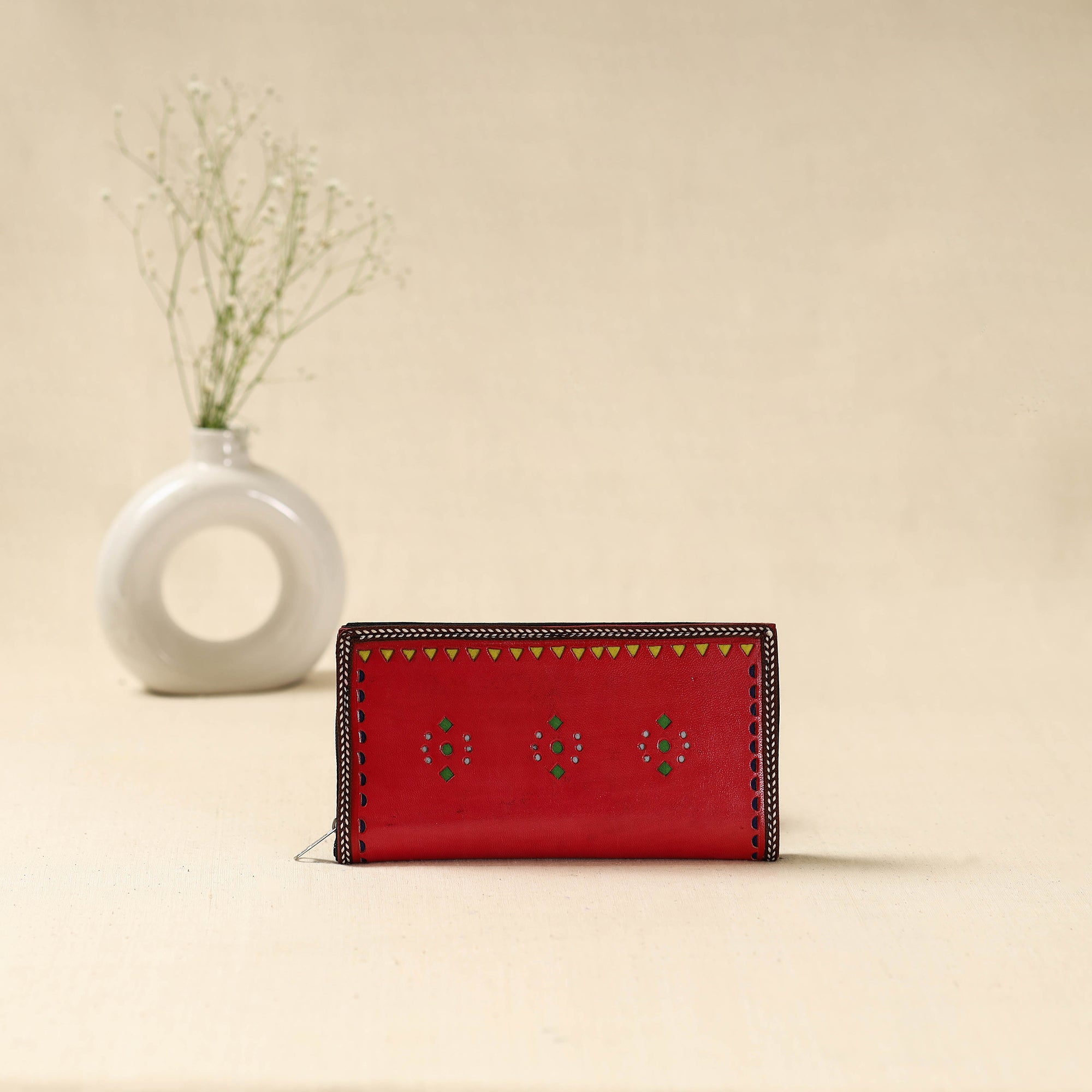 Handcrafted red clutch wallet is made using leather by skilled artisans from the Kutch region of Gujarat. Designed for everyday convenience, it features three main compartments to keep your essentials organised, along with two secure zippered pockets for valuables like cash and cards.