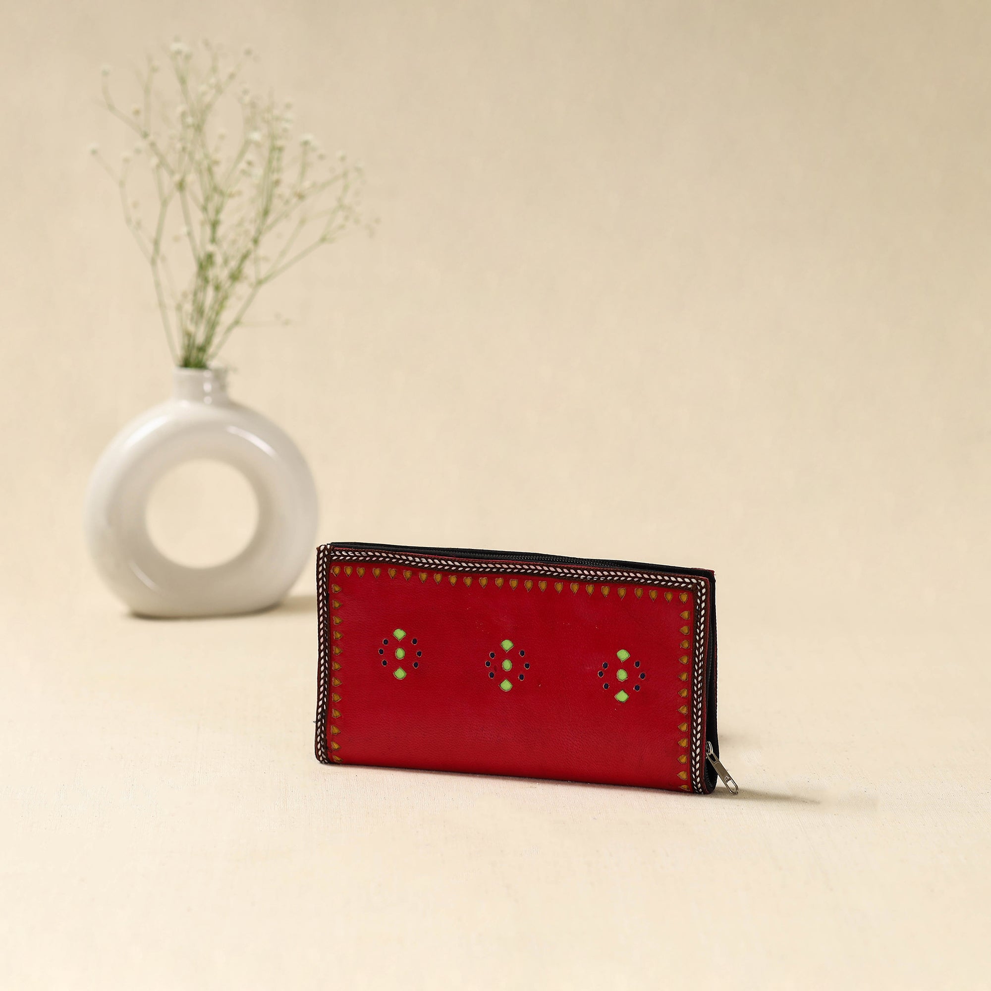 Handcrafted red clutch wallet is made using leather by skilled artisans from the Kutch region of Gujarat. Designed for everyday convenience, it features three main compartments to keep your essentials organised, along with two secure zippered pockets for valuables like cash and cards.
