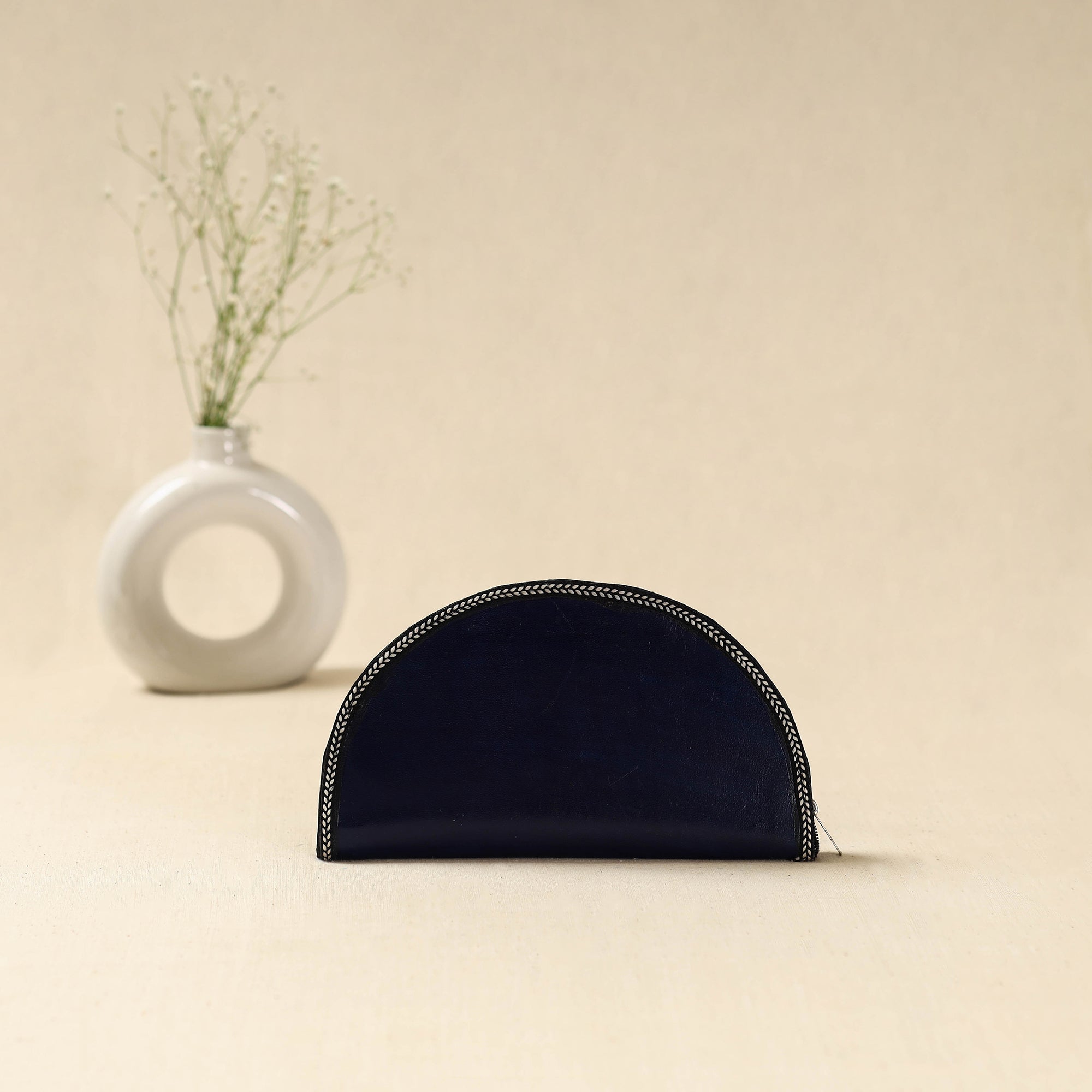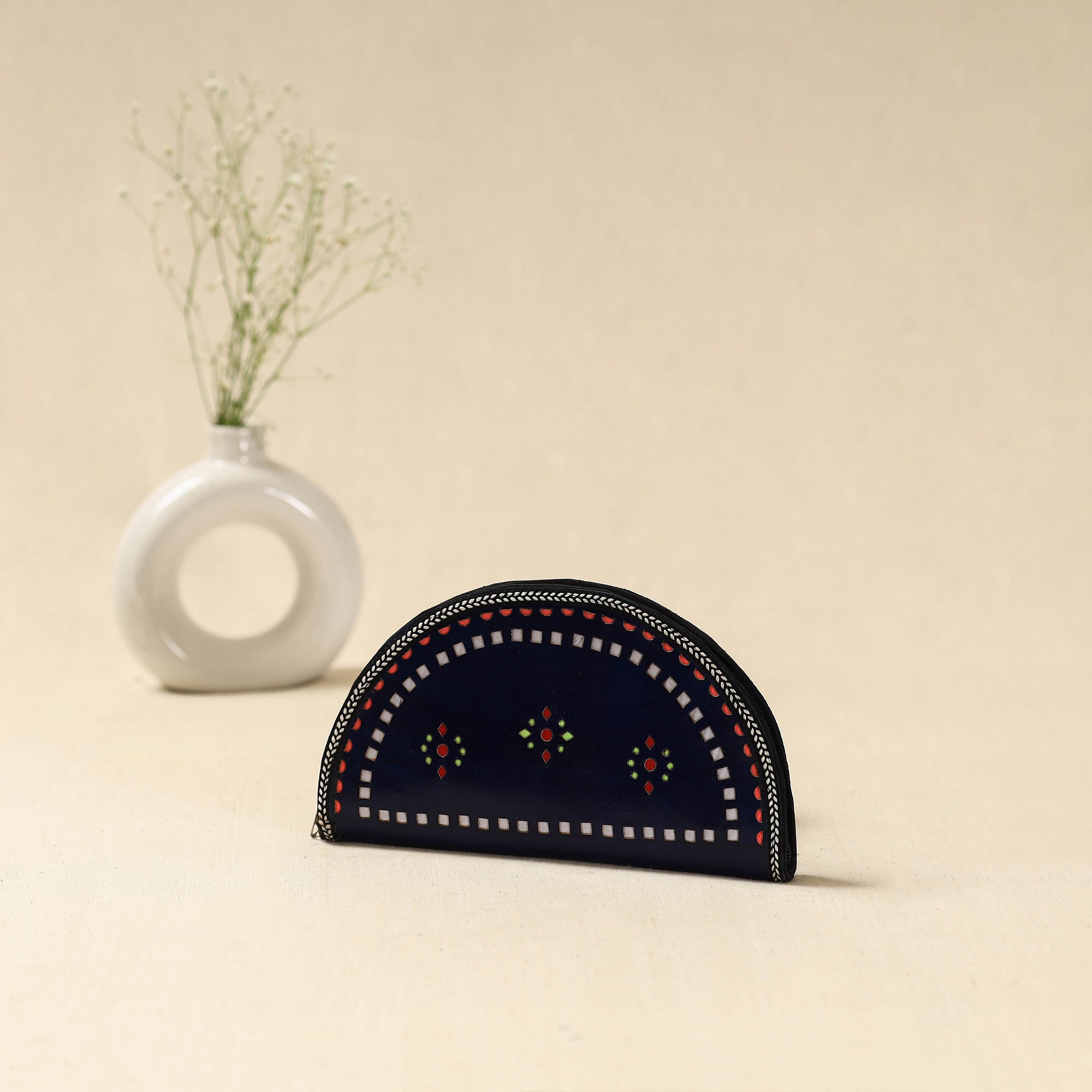Handcrafted blueclutch wallet is made using leather by skilled artisans from the Kutch region of Gujarat. Designed for everyday convenience, it features three main compartments to keep your essentials organised, along with two secure zippered pockets for valuables like cash and cards.