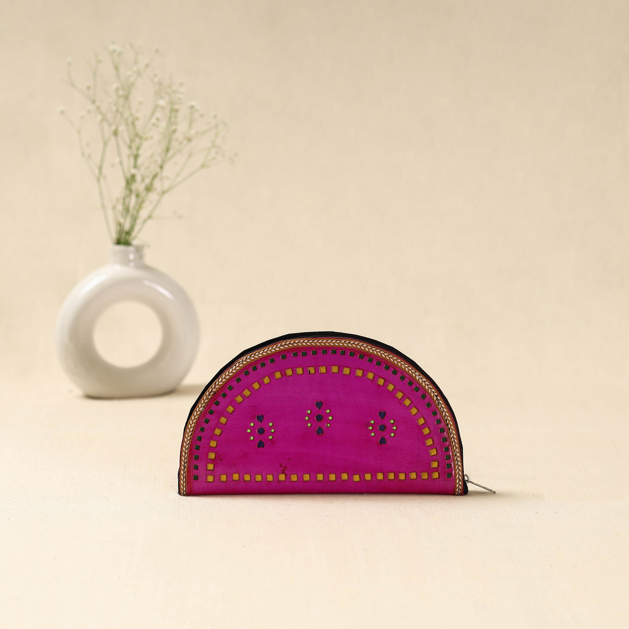Handcrafted pink clutch wallet is made using leather by skilled artisans from the Kutch region of Gujarat. Designed for everyday convenience, it features three main compartments to keep your essentials organised, along with two secure zippered pockets for valuables like cash and cards.