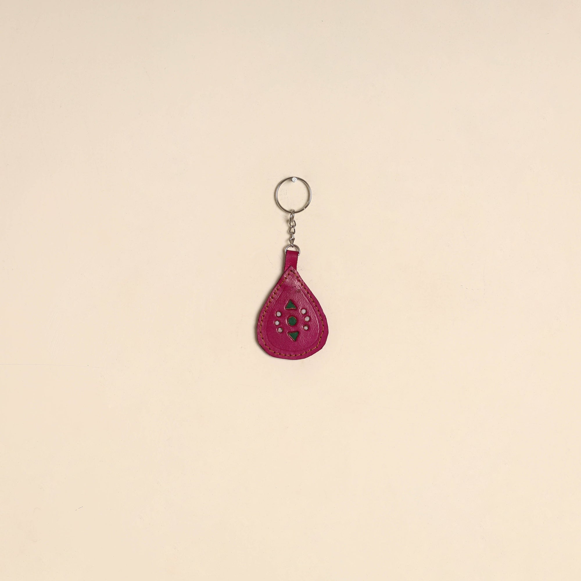 Pink handcrafted keychain is made by Mohan Marvada using traditional techniques from Kutch district in Gujarat. Crafted from durable leather it features cutwork detailing. This keychain is ideal for everyday use and thoughtful gift.