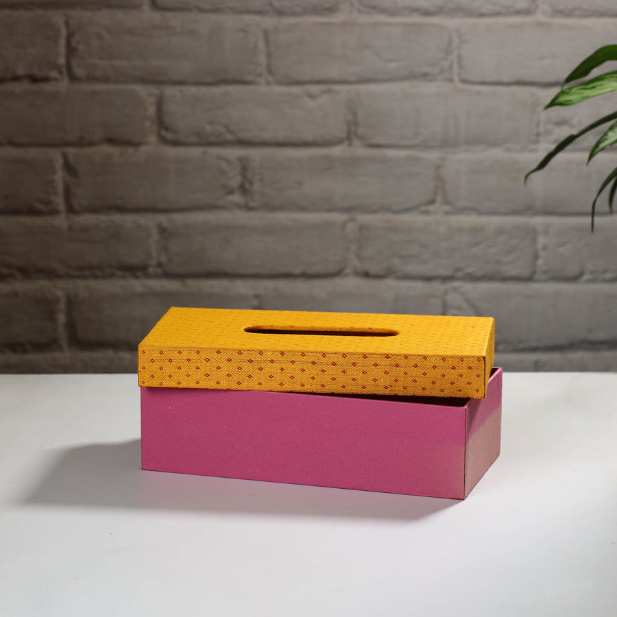 Elevate your decor with this stunning pink handcrafted mashru silk fabric tissue box. Handcrafted by skilled artisans it combines functionality with elegance. Made from durable hardboard and wrapped in handloom mashru silk this decorative tissue box is perfect for storing tissues or paper napkins. Its vibrant texture and eco-friendly craftsmanship reflect India’s rich artisanal heritage. Add a touch of charm to your living space while supporting sustainable, Handcrafted products.