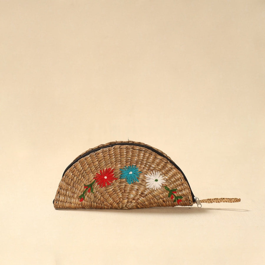 | Material | Beige handcrafted water hyacinth reed hand embroidered clutch from Assam is made by skilled artisans using dried and woven water hyacinth reed, a sturdy fiber sourced locally in the region. The tight weave gives the clutch structure and durability while maintaining a clean finish. Detailed hand embroidery features traditional and nature-inspired motifs that add character to the surface. It is lined with fabric on the inside for a neat finish and added support. Designed with a secure zipper closure, it offers enough space for money, cards and small essentials, making it suitable for everyday outings as well as special occasions. |