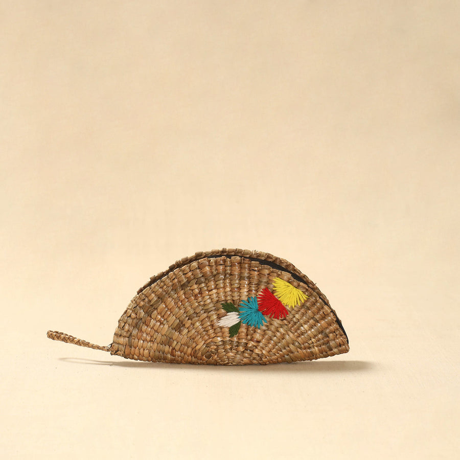 Beige handcrafted water hyacinth reed hand embroidered clutch from Assam is made by skilled artisans using dried and woven water hyacinth reed, a sturdy fiber sourced locally in the region. The tight weave gives the clutch structure and durability while maintaining a clean finish. Detailed hand embroidery features traditional and nature-inspired motifs that add character to the surface. It is lined with fabric on the inside for a neat finish and added support. Designed with a secure zipper closure, it offers enough space for money, cards and small essentials, making it suitable for everyday outings as well as special occasions.