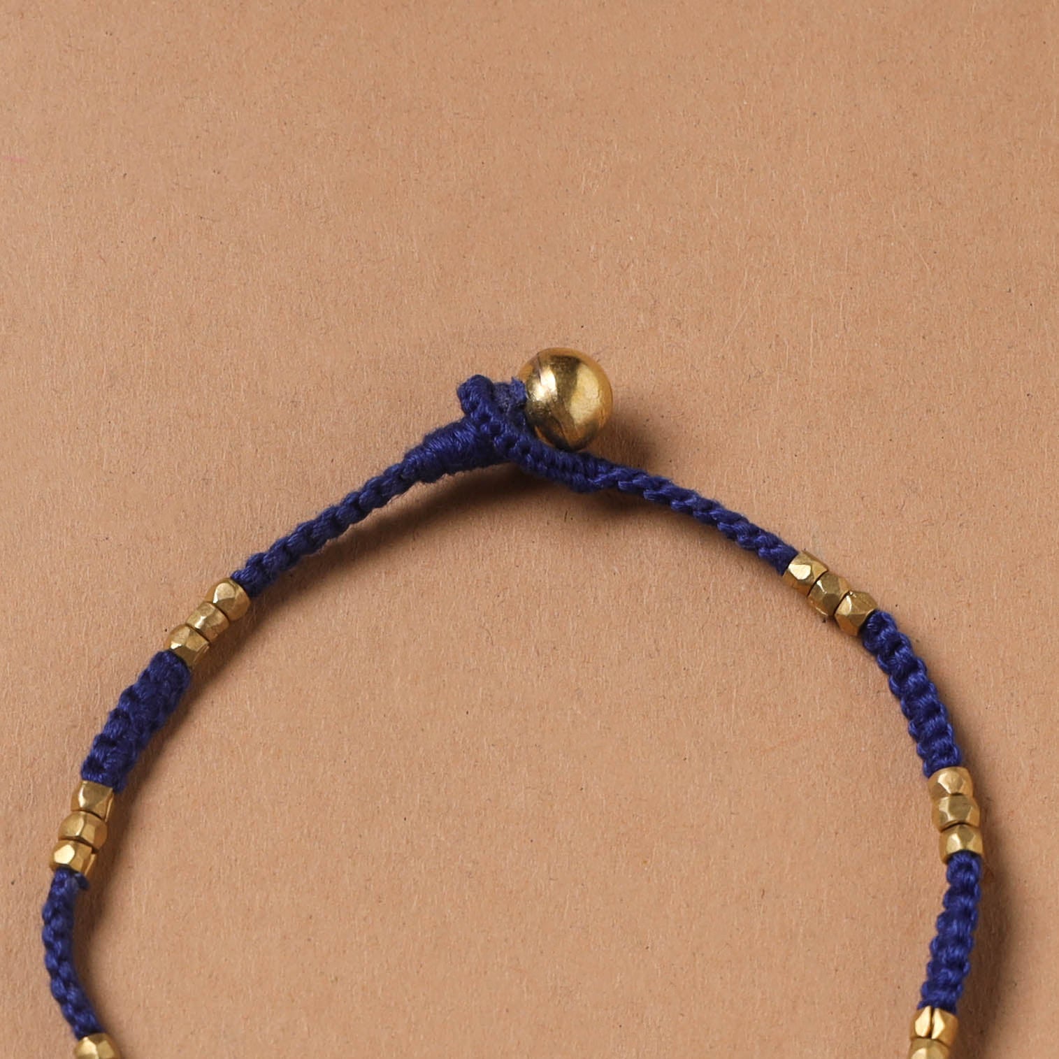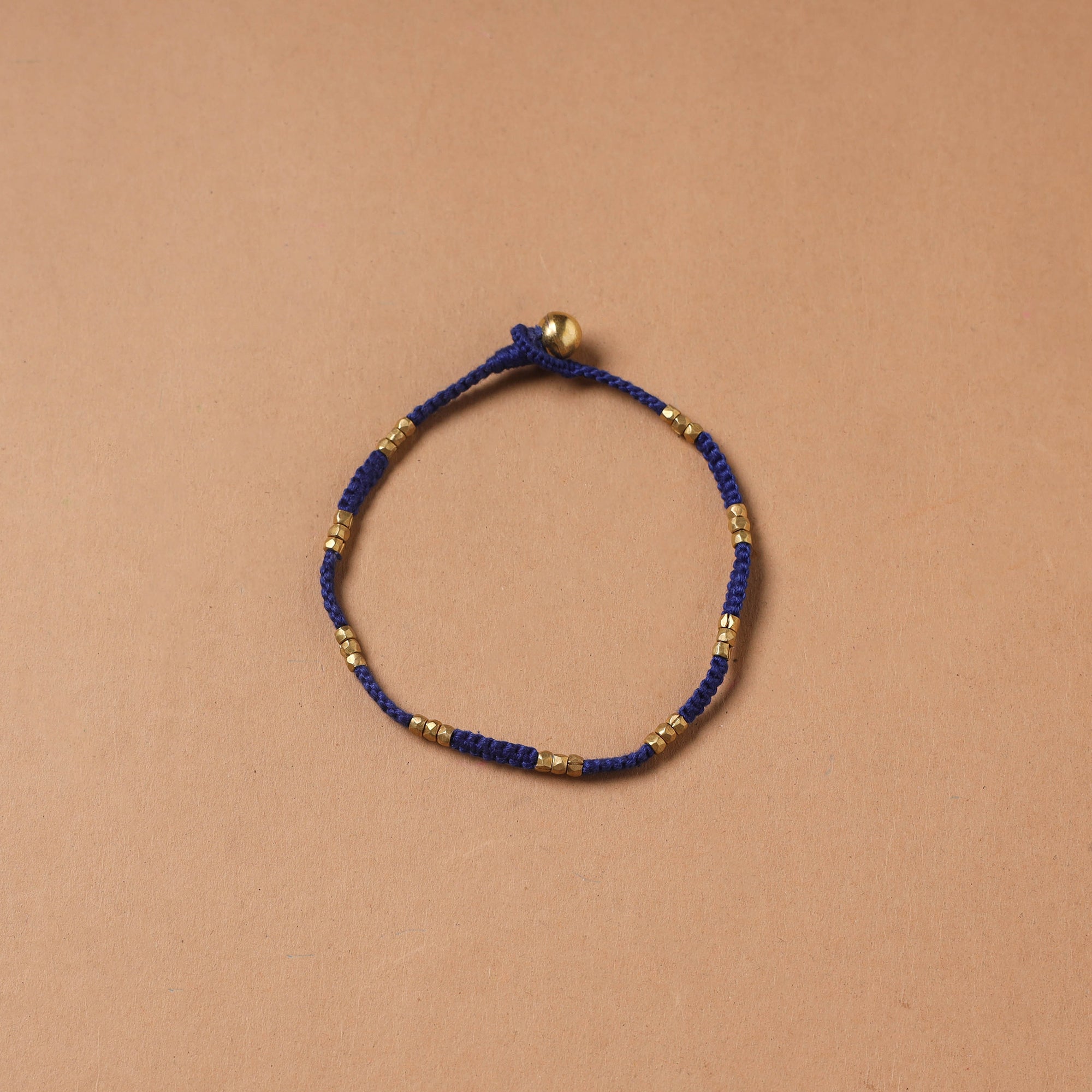 Handcrafted brass metal alloy dokra beads threadwork anklet, made by tribal artisan Pradeep Narayan using the ancient lost-wax casting technique known as cire perdue, practiced for over 4,000 years. Each bead is shaped by hand and combined with cotton thread, reflecting careful craftsmanship. This time-intensive method involves replacing wax with molten metal and is still followed in tribal regions of Chhattisgarh and Odisha. Lightweight yet detailed, this anklet adds an ethnic charm to everyday wear, festive looks or cultural outfits.