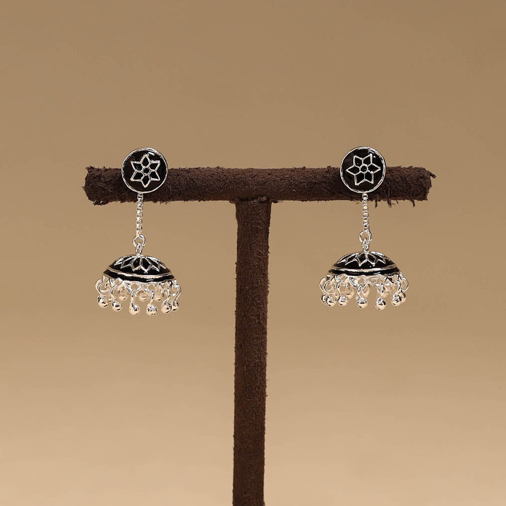 Black handcrafted paka meenakari jhumki earrings by Sukhomoy. Meticulously crafted from a bronze alloy, these earrings showcase the ancient art of Meenakari, which involves coloring and ornamenting metal surfaces by fusing vibrant colors into intricate designs. The Mughals invented the art of enamel or meenawork metalcraft and it was popular with both the Mughals and the Hindu princes of Rajasthan, where it was used for creating precious objects and enriching jewellery.