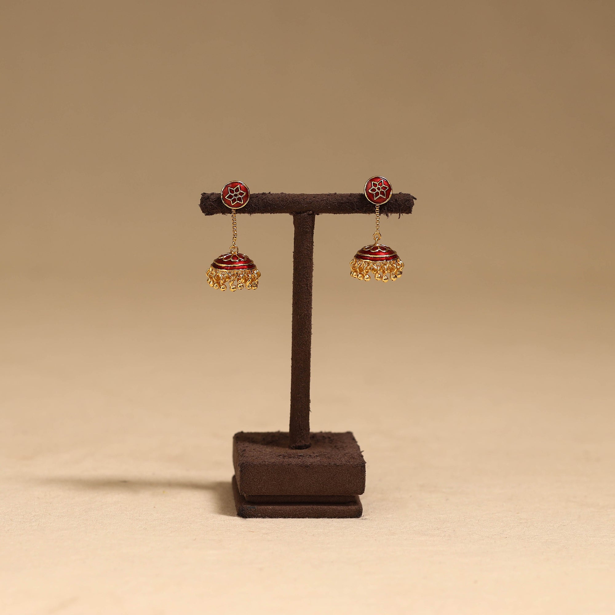 Red handcrafted paka meenakari jhumki earrings by Sukhomoy. Meticulously crafted from a bronze alloy, these earrings showcase the ancient art of Meenakari, which involves coloring and ornamenting metal surfaces by fusing vibrant colors into intricate designs. The Mughals invented the art of enamel or meenawork metalcraft and it was popular with both the Mughals and the Hindu princes of Rajasthan, where it was used for creating precious objects and enriching jewellery.