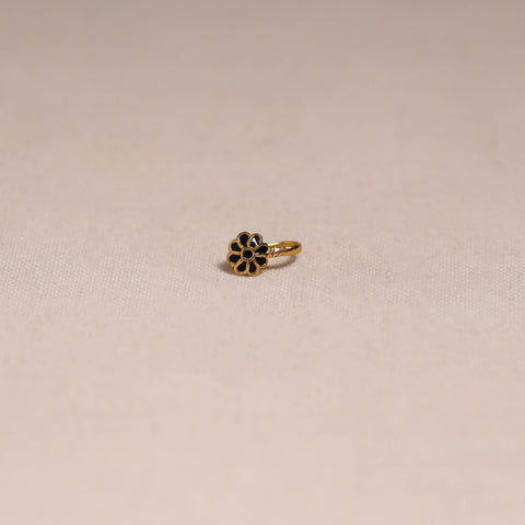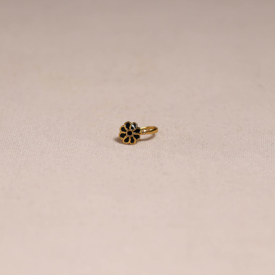 | Material | Black handcrafted paka meenakari nosepin by Sukhomoy Mukherjee's. Meticulously crafted from a bronze alloy, this nosepin showcase the ancient art of Meenakari, which involves coloring and ornamenting metal surfaces by fusing vibrant colors into intricate designs. The Mughals invented the art of enamel or meenawork metalcraft, and it was popular with both the Mughals and the Hindu princes of Rajasthan, where it was used for creating precious objects and enriching jewellery. |