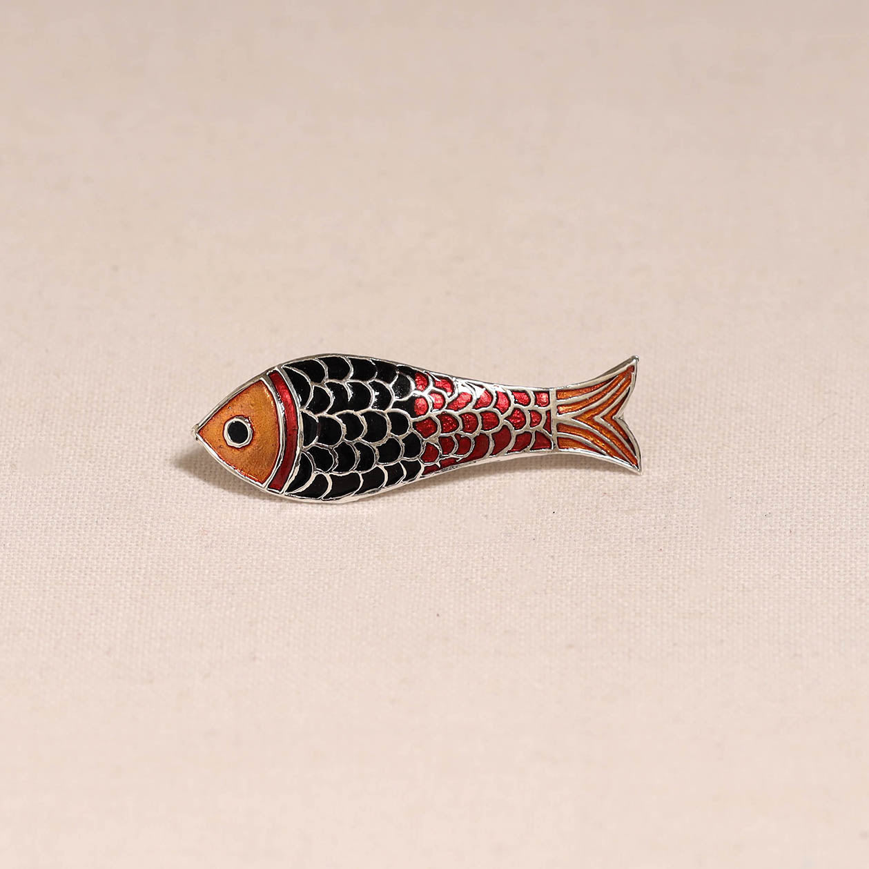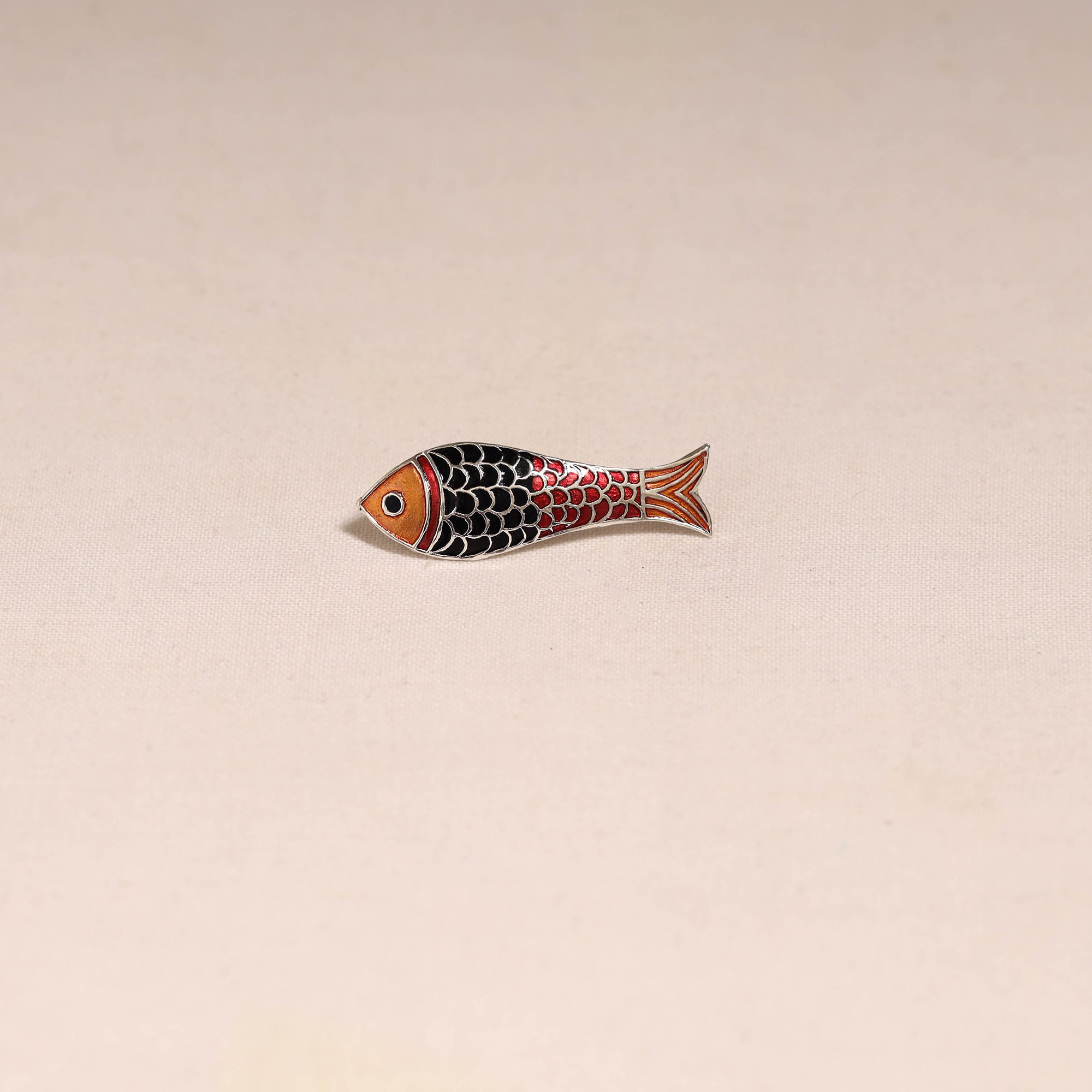 Handcrafted paka meenakari saree pin by Sukhomoy Mukherjee's. Meticulously crafted from a bronze alloy, this saree pin showcase the ancient art of Meenakari, which involves coloring and ornamenting metal surfaces by fusing vibrant colors into intricate designs. The Mughals invented the art of enamel or meenawork metalcraft and it was popular with both the Mughals and the Hindu princes of Rajasthan, where it was used for creating precious objects and enriching jewellery.