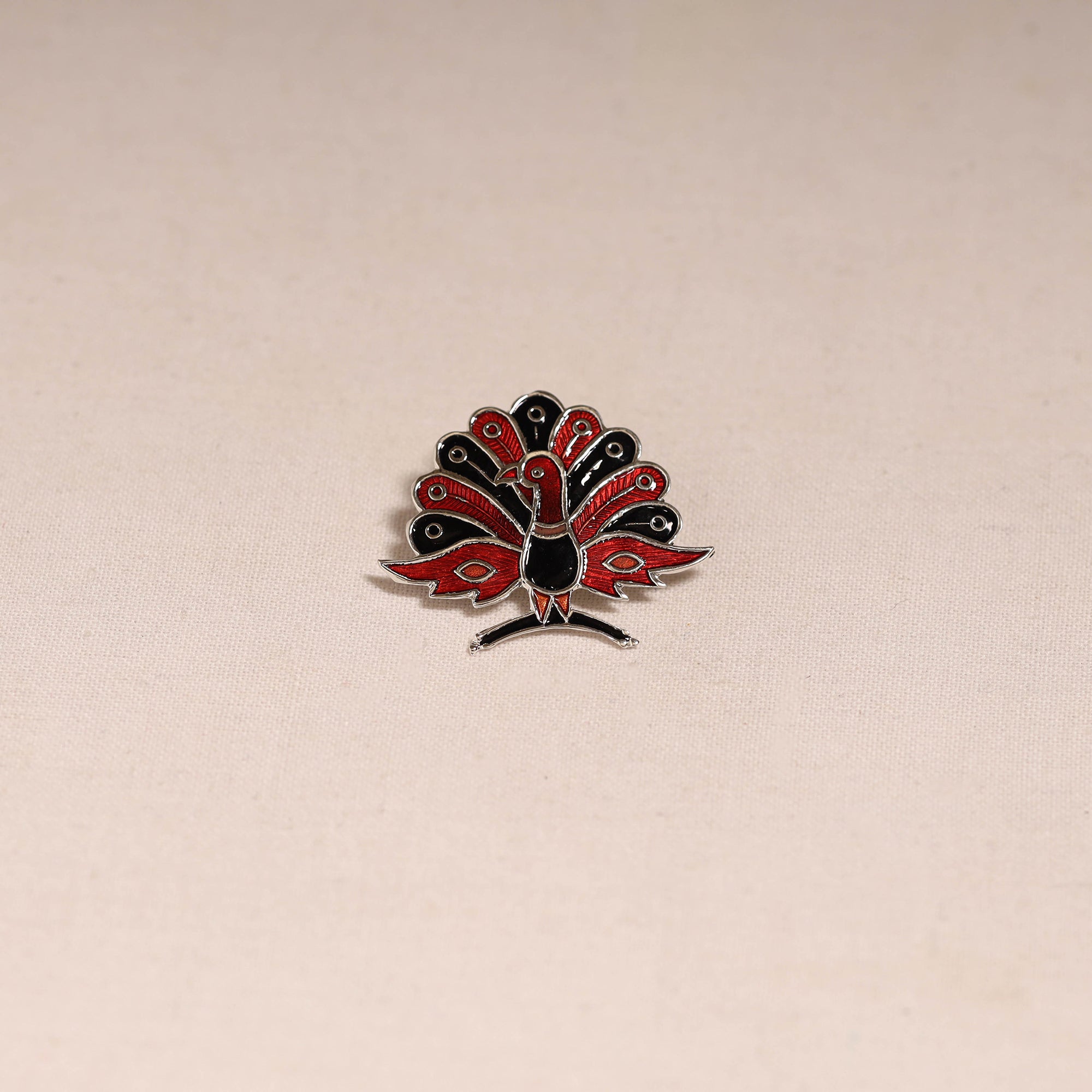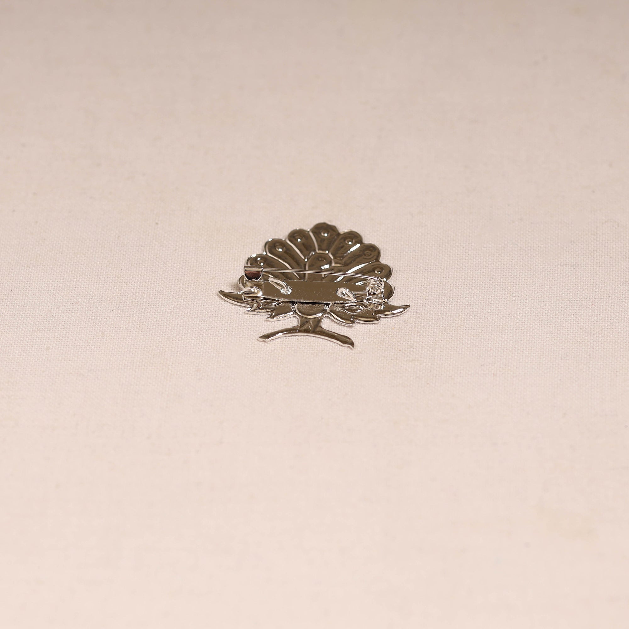 Handcrafted paka meenakari saree pin by Sukhomoy Mukherjee's. Meticulously crafted from a bronze alloy, this saree pin showcase the ancient art of Meenakari, which involves coloring and ornamenting metal surfaces by fusing vibrant colors into intricate designs. The Mughals invented the art of enamel or meenawork metalcraft and it was popular with both the Mughals and the Hindu princes of Rajasthan, where it was used for creating precious objects and enriching jewellery.