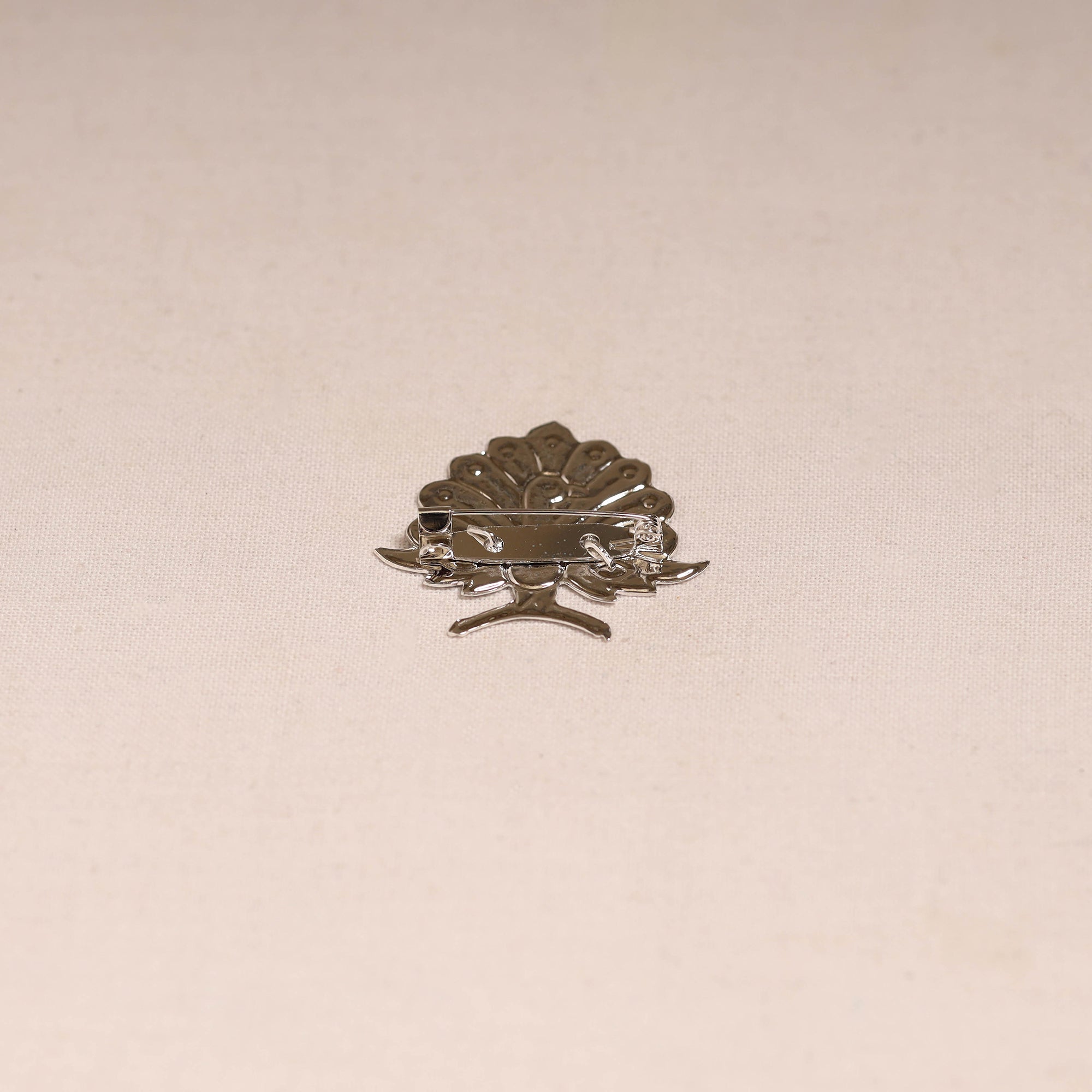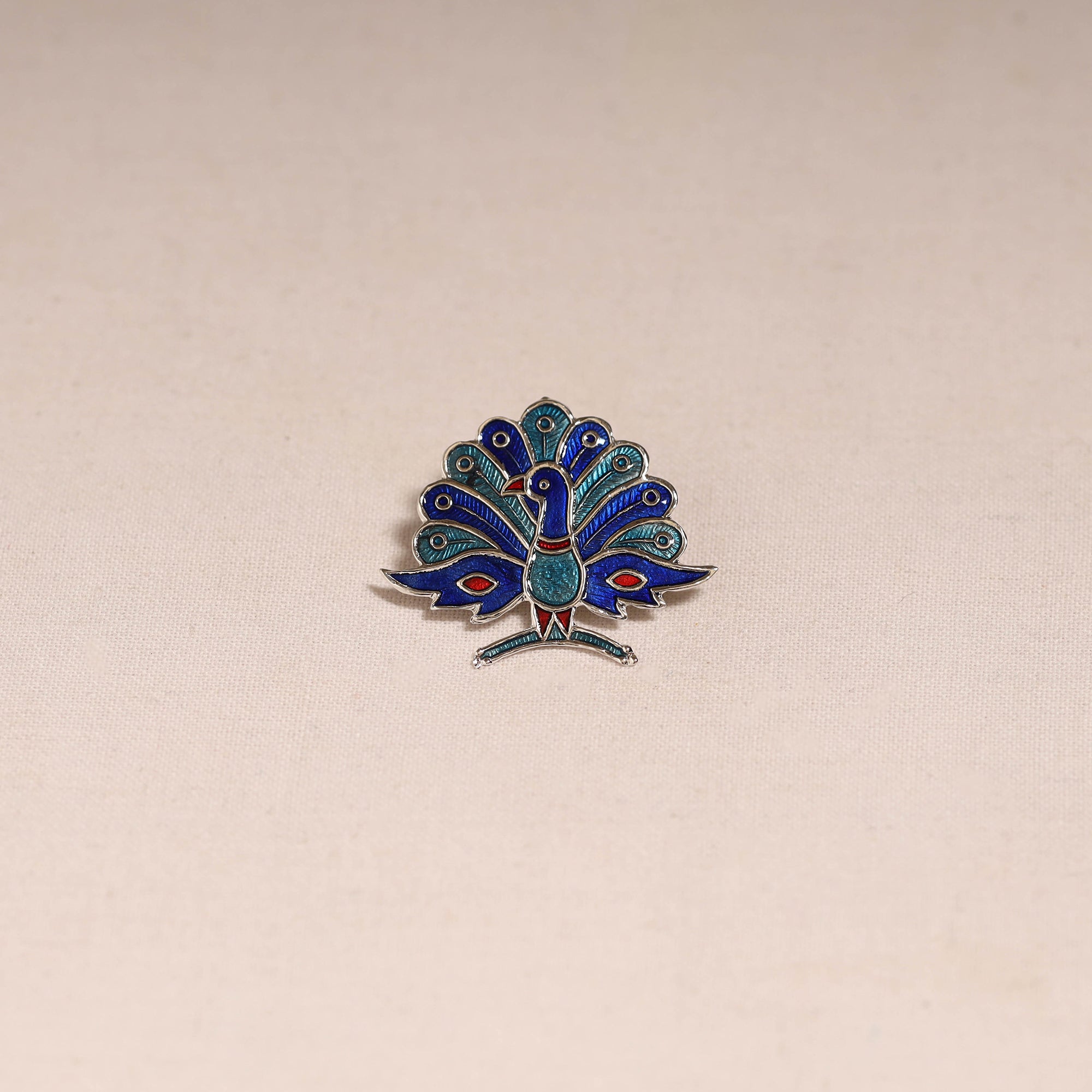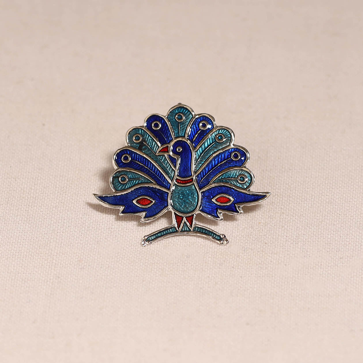Handcrafted paka meenakari saree pin by Sukhomoy Mukherjee's. Meticulously crafted from a bronze alloy, this saree pin showcase the ancient art of Meenakari, which involves coloring and ornamenting metal surfaces by fusing vibrant colors into intricate designs. The Mughals invented the art of enamel or meenawork metalcraft and it was popular with both the Mughals and the Hindu princes of Rajasthan, where it was used for creating precious objects and enriching jewellery.