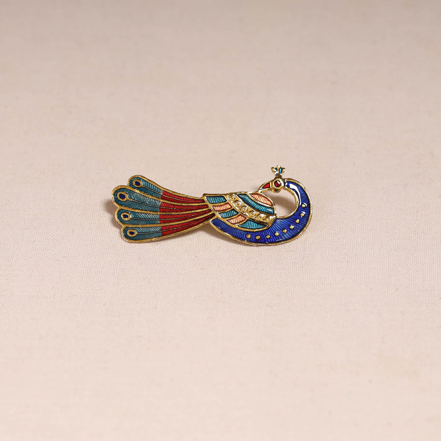 | Material | Blue handcrafted paka meenakari saree pin by Sukhomoy Mukherjee's. Meticulously crafted from a bronze alloy, this saree pin showcase the ancient art of Meenakari, which involves coloring and ornamenting metal surfaces by fusing vibrant colors into intricate designs. The Mughals invented the art of enamel or meenawork metalcraft and it was popular with both the Mughals and the Hindu princes of Rajasthan, where it was used for creating precious objects and enriching jewellery. |