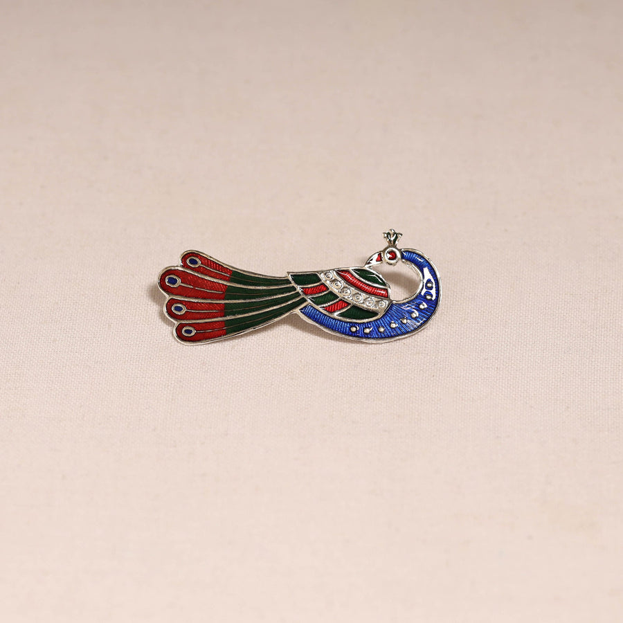 | Material | Blue handcrafted paka meenakari saree pin by Sukhomoy Mukherjee's. Meticulously crafted from a bronze alloy, this saree pin showcase the ancient art of Meenakari, which involves coloring and ornamenting metal surfaces by fusing vibrant colors into intricate designs. The Mughals invented the art of enamel or meenawork metalcraft and it was popular with both the Mughals and the Hindu princes of Rajasthan, where it was used for creating precious objects and enriching jewellery. |
