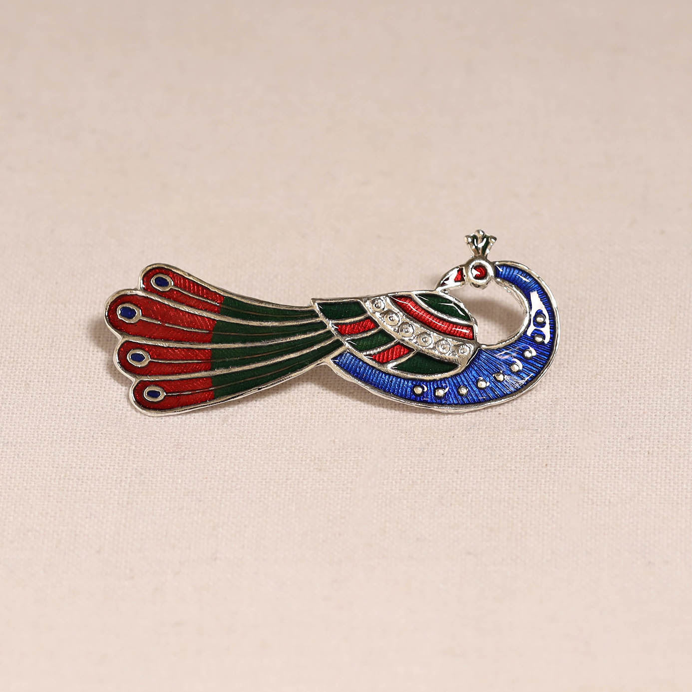 Handcrafted paka meenakari saree pin by Sukhomoy Mukherjee's. Meticulously crafted from a bronze alloy, this saree pin showcase the ancient art of Meenakari, which involves coloring and ornamenting metal surfaces by fusing vibrant colors into intricate designs. The Mughals invented the art of enamel or meenawork metalcraft and it was popular with both the Mughals and the Hindu princes of Rajasthan, where it was used for creating precious objects and enriching jewellery.