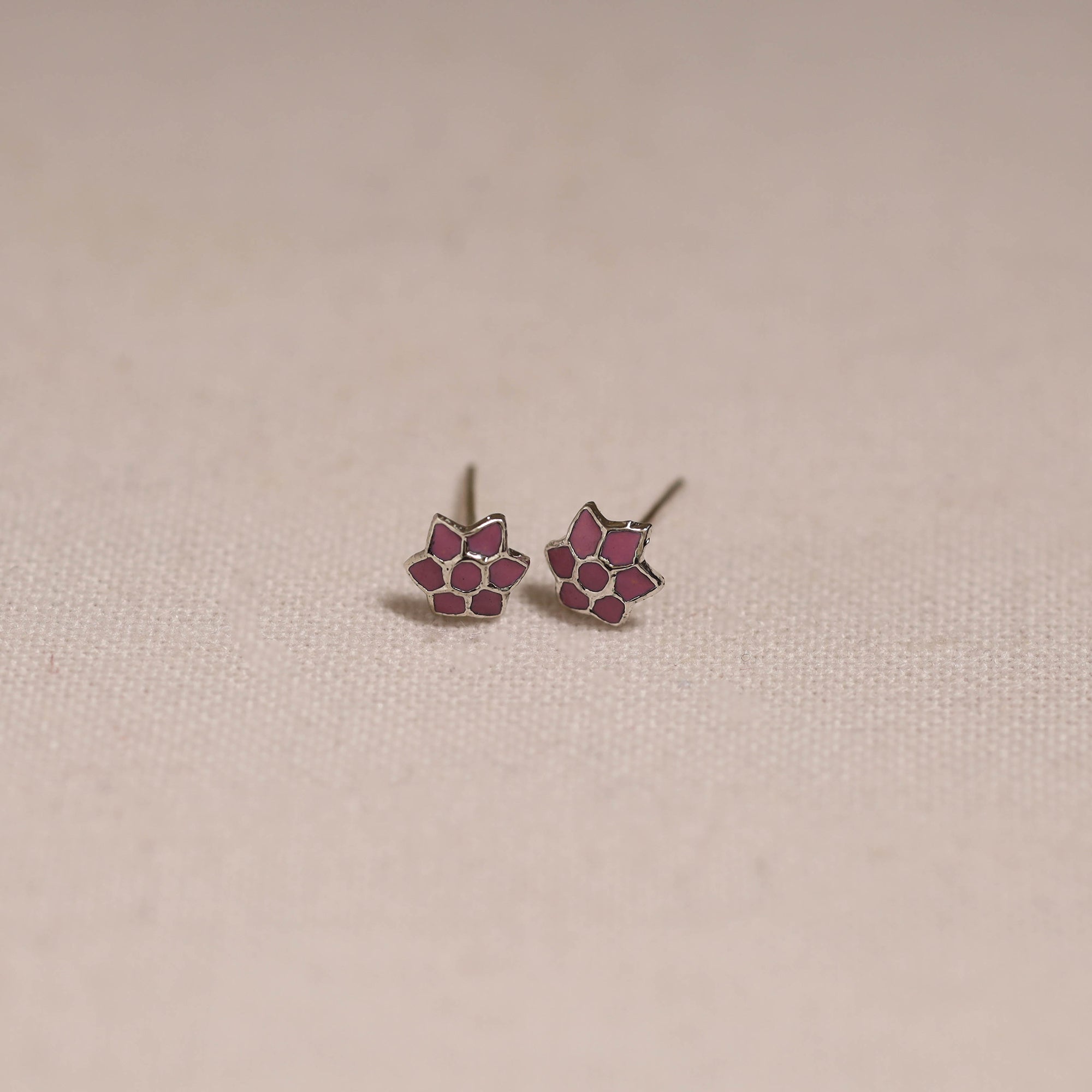 Pink handcrafted paka meenakari stud earrings by Sukhomoy Mukherjee's. Meticulously crafted from a bronze alloy, these earrings showcase the ancient art of Meenakari, which involves coloring and ornamenting metal surfaces by fusing vibrant colors into intricate designs. The Mughals invented the art of enamel or meenawork metalcraft and it was popular with both the Mughals and the Hindu princes of Rajasthan, where it was used for creating precious objects and enriching jewellery.