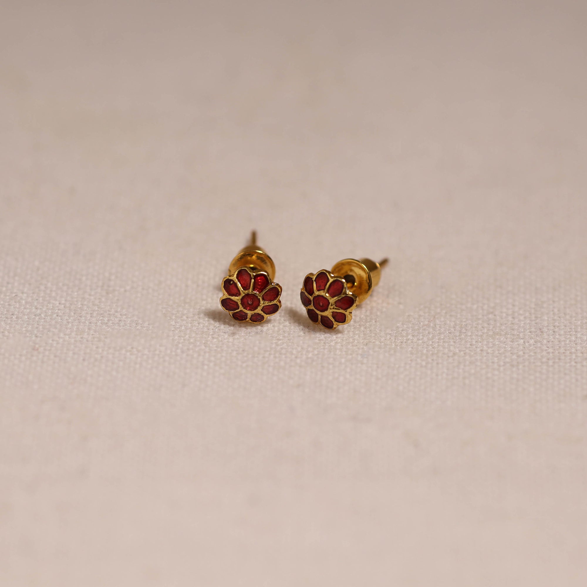 Red handcrafted paka meenakari stud earrings by Sukhomoy Mukherjee's. Meticulously crafted from a bronze alloy, these earrings showcase the ancient art of Meenakari, which involves coloring and ornamenting metal surfaces by fusing vibrant colors into intricate designs. The Mughals invented the art of enamel or meenawork metalcraft and it was popular with both the Mughals and the Hindu princes of Rajasthan, where it was used for creating precious objects and enriching jewellery.