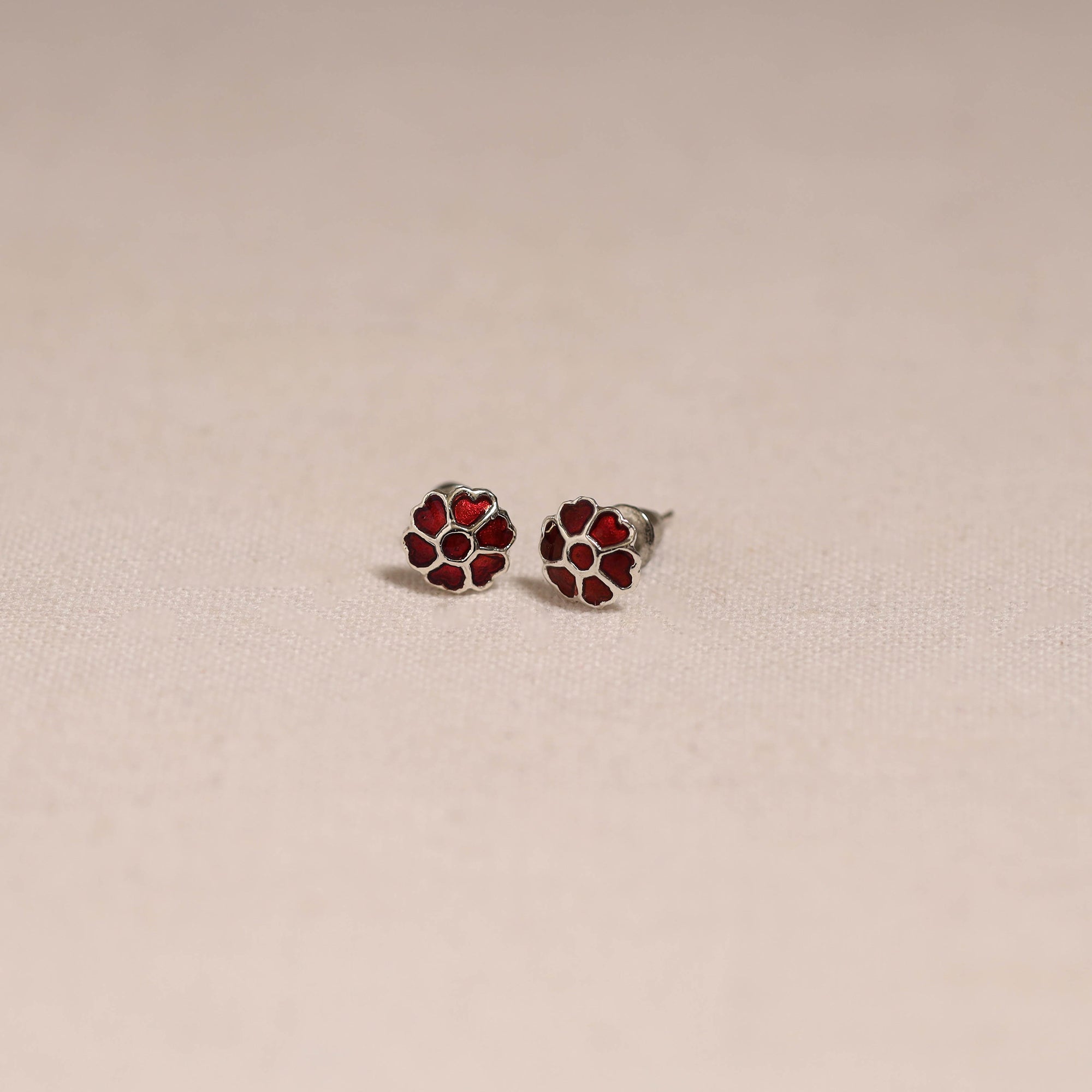 Red handcrafted paka meenakari stud earrings by Sukhomoy Mukherjee's. Meticulously crafted from a bronze alloy, these earrings showcase the ancient art of Meenakari, which involves coloring and ornamenting metal surfaces by fusing vibrant colors into intricate designs. The Mughals invented the art of enamel or meenawork metalcraft and it was popular with both the Mughals and the Hindu princes of Rajasthan, where it was used for creating precious objects and enriching jewellery.