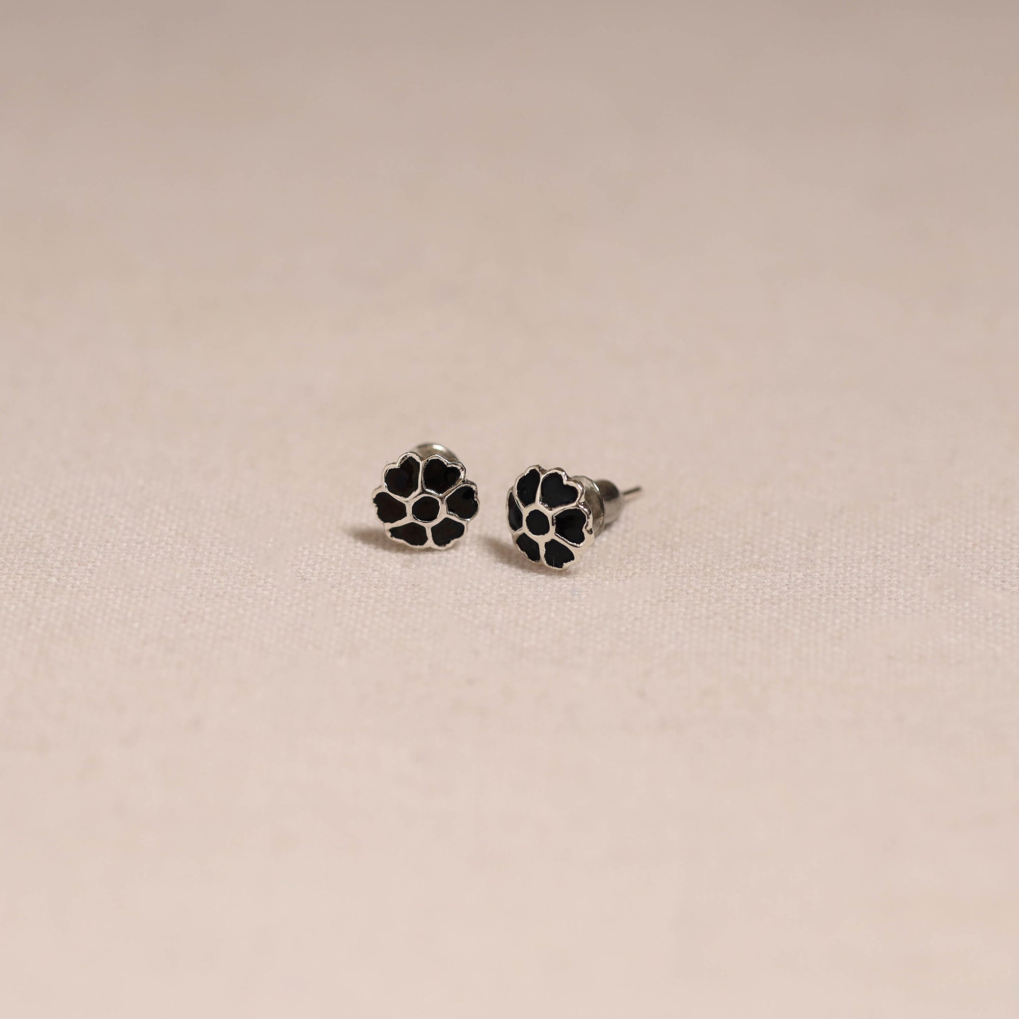 Black handcrafted paka meenakari stud earrings by Sukhomoy Mukherjee's. Meticulously crafted from a bronze alloy, these earrings showcase the ancient art of Meenakari, which involves coloring and ornamenting metal surfaces by fusing vibrant colors into intricate designs. The Mughals invented the art of enamel or meenawork metalcraft and it was popular with both the Mughals and the Hindu princes of Rajasthan, where it was used for creating precious objects and enriching jewellery.