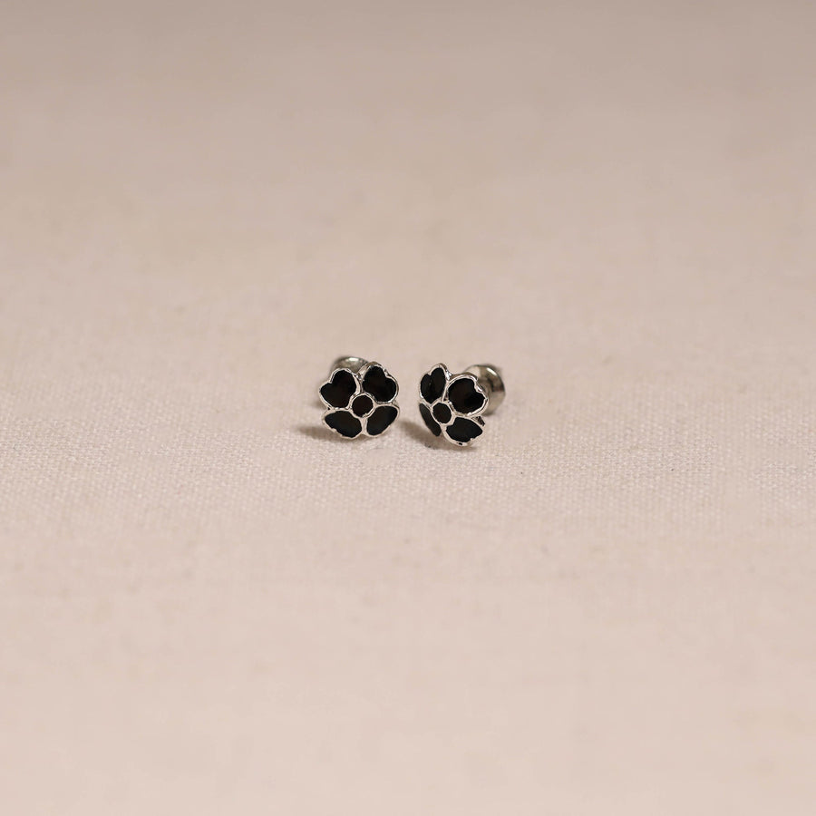 Black handcrafted paka meenakari stud earrings by Sukhomoy Mukherjee's. Meticulously crafted from a bronze alloy, these earrings showcase the ancient art of Meenakari, which involves coloring and ornamenting metal surfaces by fusing vibrant colors into intricate designs. The Mughals invented the art of enamel or meenawork metalcraft and it was popular with both the Mughals and the Hindu princes of Rajasthan, where it was used for creating precious objects and enriching jewellery.