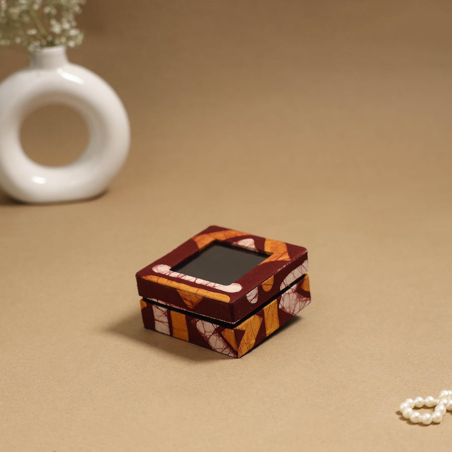 This maroon handcrafted printed fabric ring and earring box offers four spacious rows, each designed to hold multiple finger rings or earring pairs. The interior features a soft velvet lining to protect your jewellery, while the sturdy millboard base wrapped in cotton fabric adds durability. A practical and elegant organiser, perfect for everyday use or thoughtful gifting.