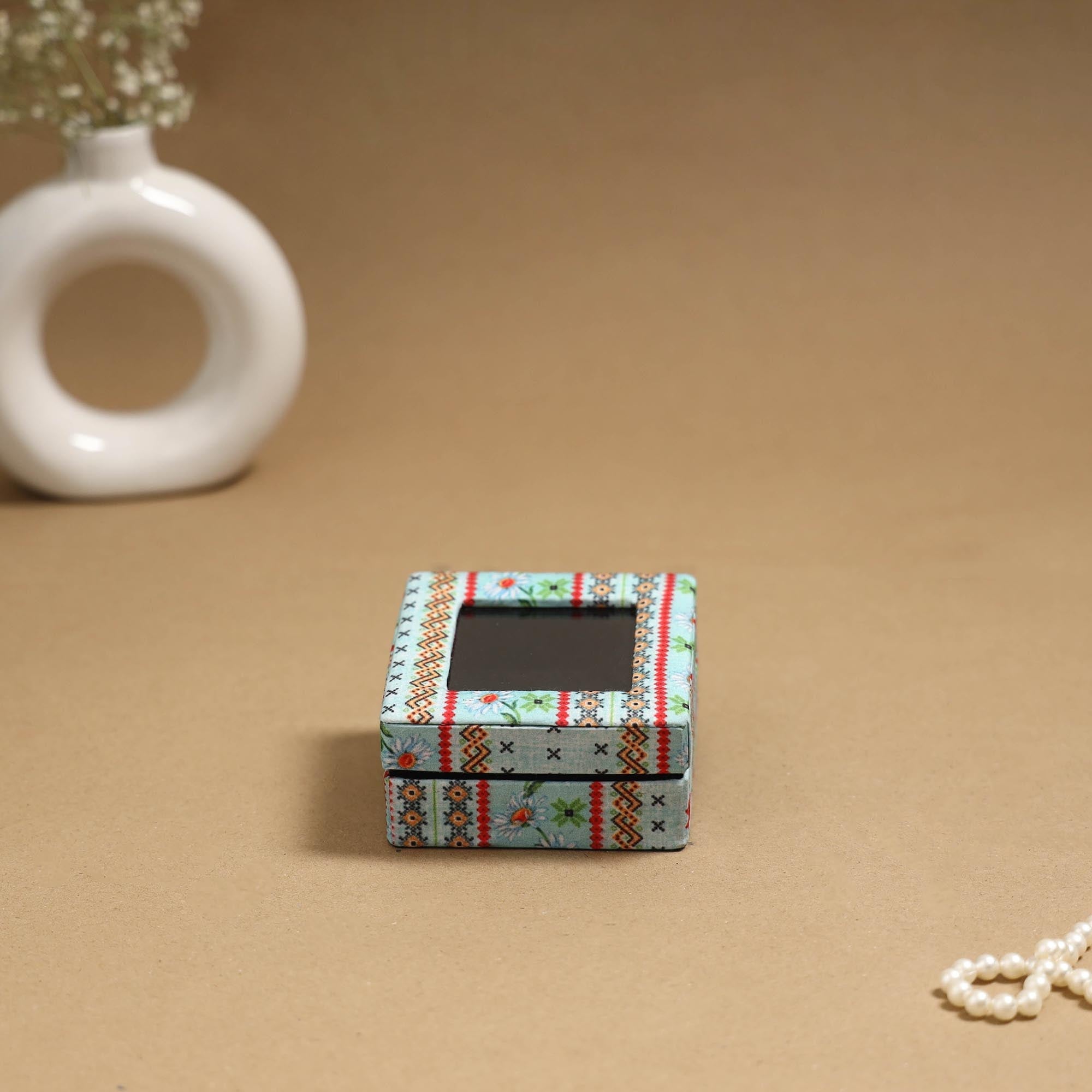 This blue handcrafted printed fabric ring and earring box offers four spacious rows, each designed to hold multiple finger rings or earring pairs. The interior features a soft velvet lining to protect your jewellery, while the sturdy millboard base wrapped in cotton fabric adds durability. A practical and elegant organiser, perfect for everyday use or thoughtful gifting.