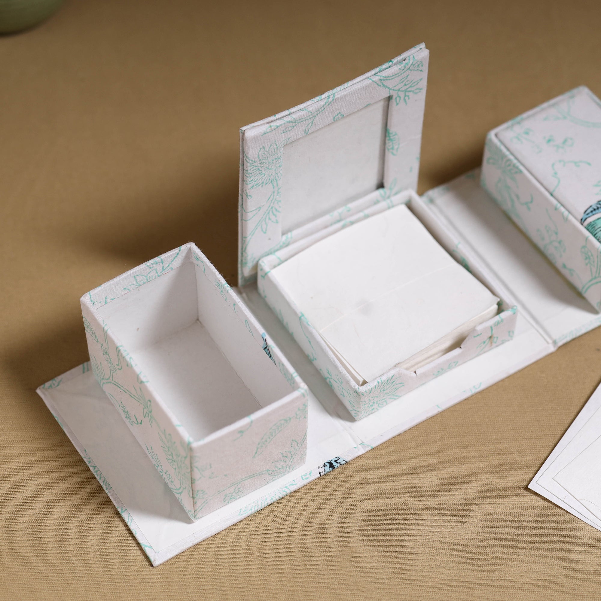 Handcrafted white blue printed stationery kit is designed to keep your workspace neat, creative, and complete. Perfect for students and professionals, it includes all the right essentials for daily use. Made from durable cardboard and covered with block printed cotton fabric, it’s easy to carry, elegant in look and adds charm to any home or office desk.
