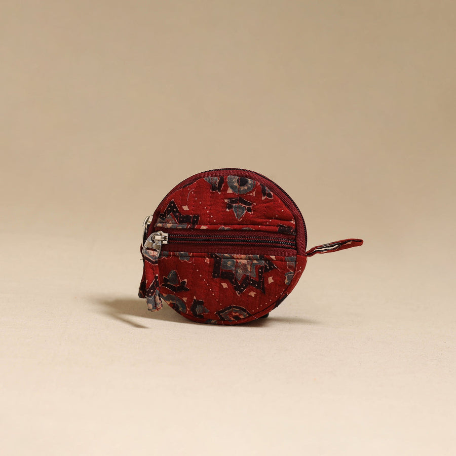 Handcrafted quilted red ajrakh block printed fabric suneeta coin pouch is developed by iTokri in collaboration with Chhoti Si Asha. Compact and round in shape, it is designed to store coins, earbuds, folded notes, and small jewellery. The quilted structure helps maintain shape while protecting contents. It features a smooth zip closure for secure storage. Soft and easy to carry, it fits neatly into bags or pockets, while the side loop allows quick handling or easy attachment.