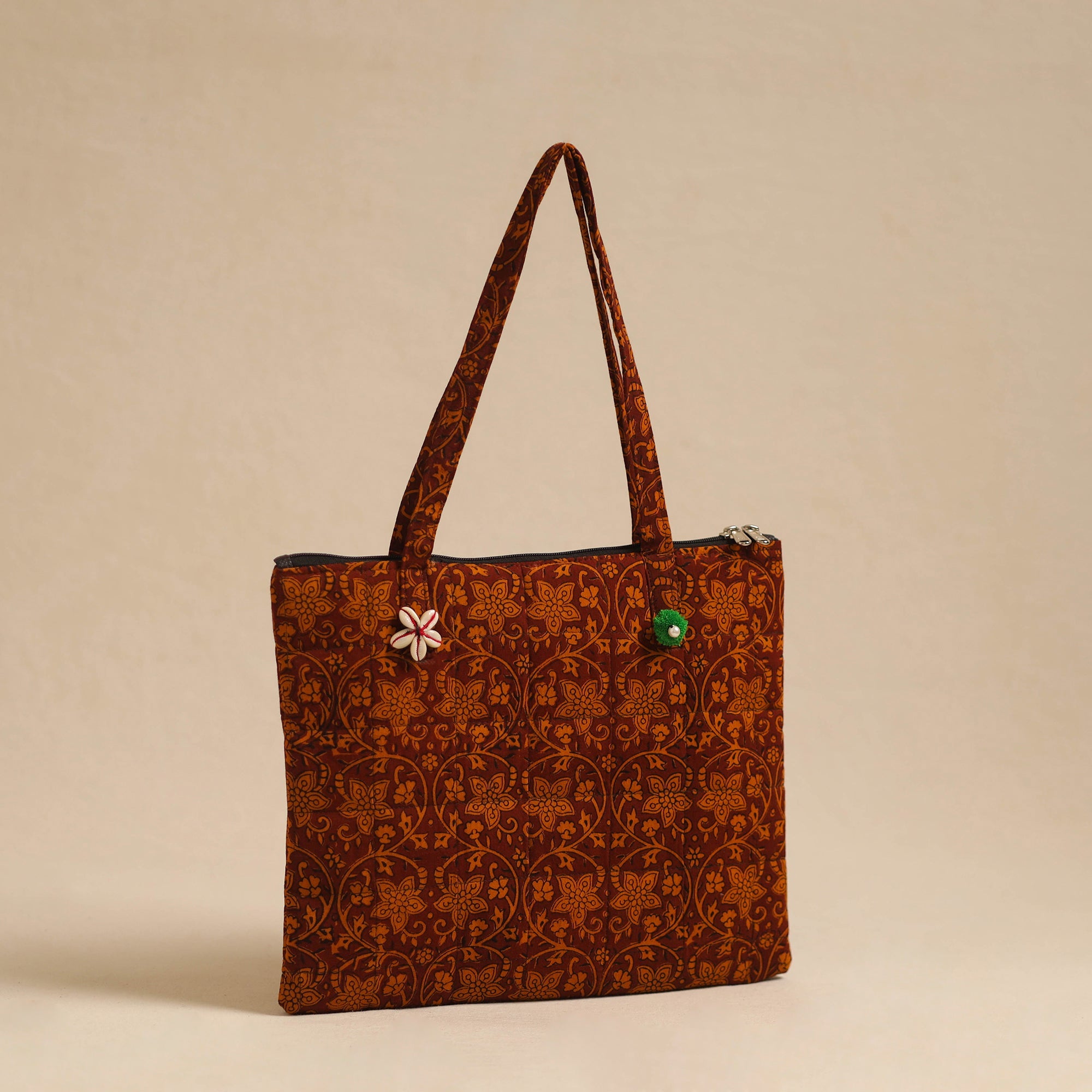 Orange handcrafted quilted cotton hand bag. This hand bag with a zip-lock main closure, providing ample space for your essentials. The foam layer lining ensures durability and protection. Enhance your style with this unique, functional accessory.