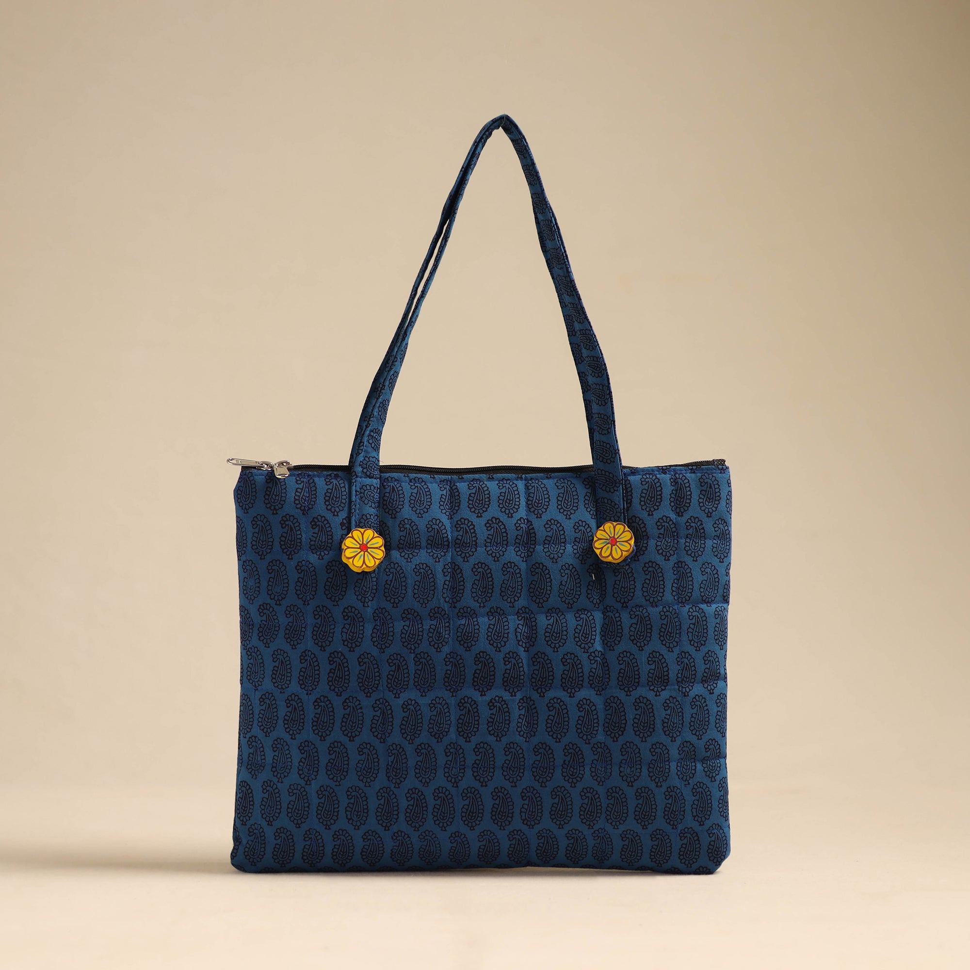 Blue handcrafted quilted cotton hand bag. This hand bag with a zip-lock main closure, providing ample space for your essentials. The foam layer lining ensures durability and protection. Enhance your style with this unique, functional accessory.