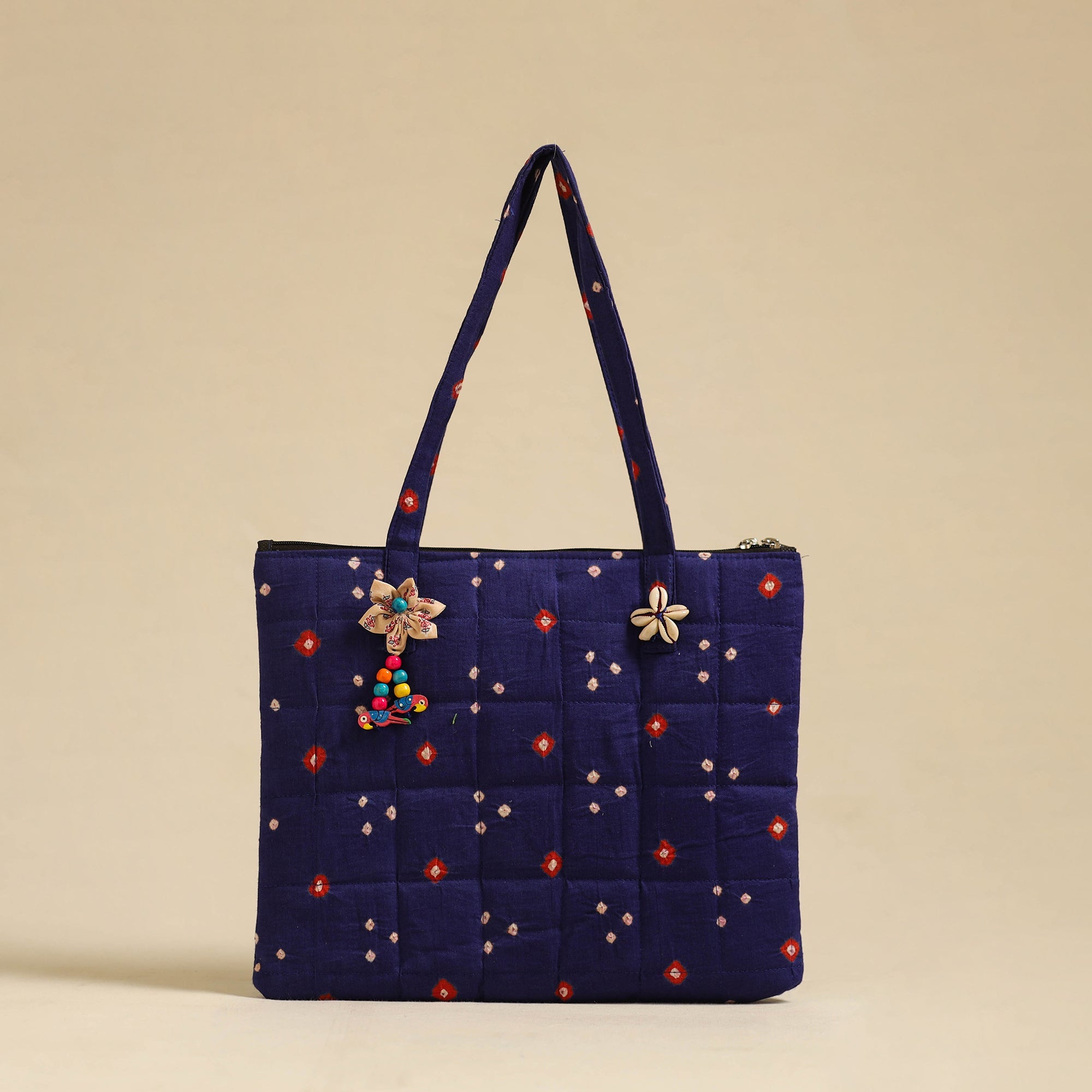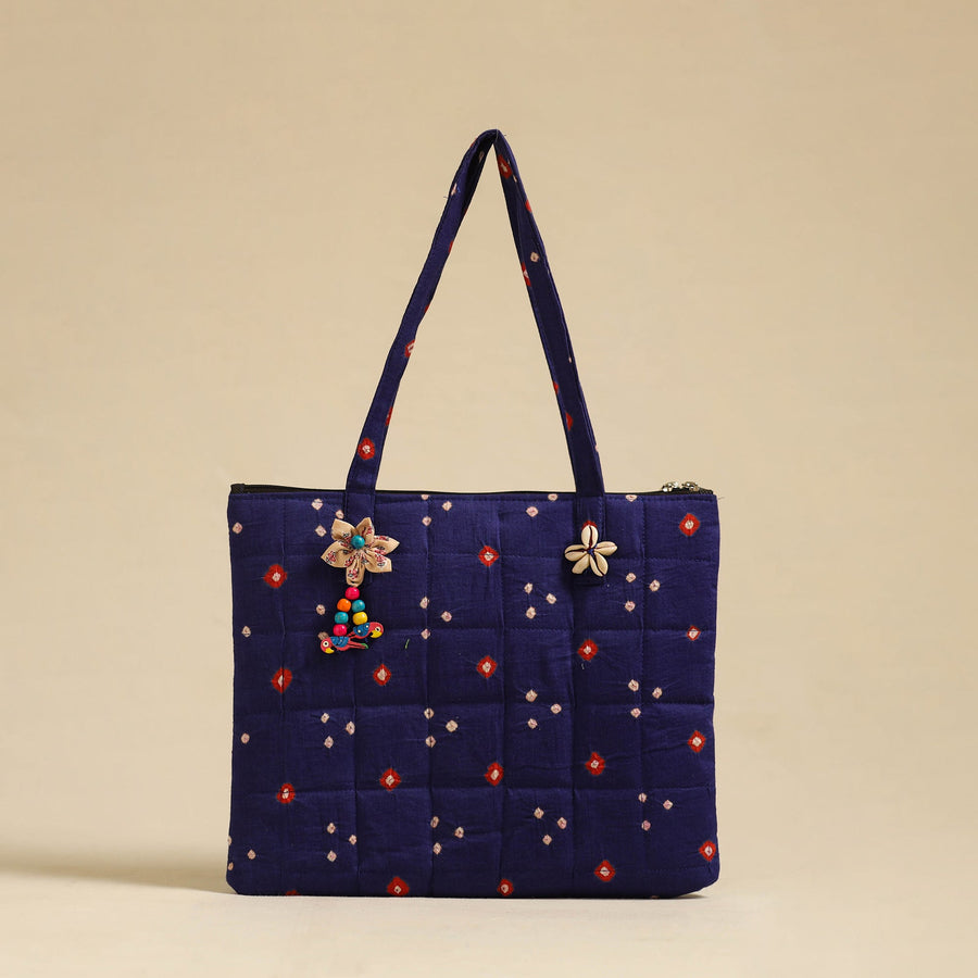 Blue handcrafted quilted cotton hand bag. This hand bag with a zip-lock main closure, providing ample space for your essentials. The foam layer lining ensures durability and protection. Enhance your style with this unique, functional accessory.