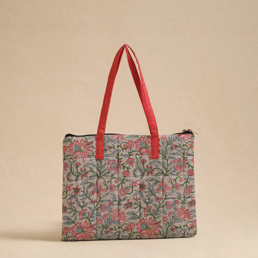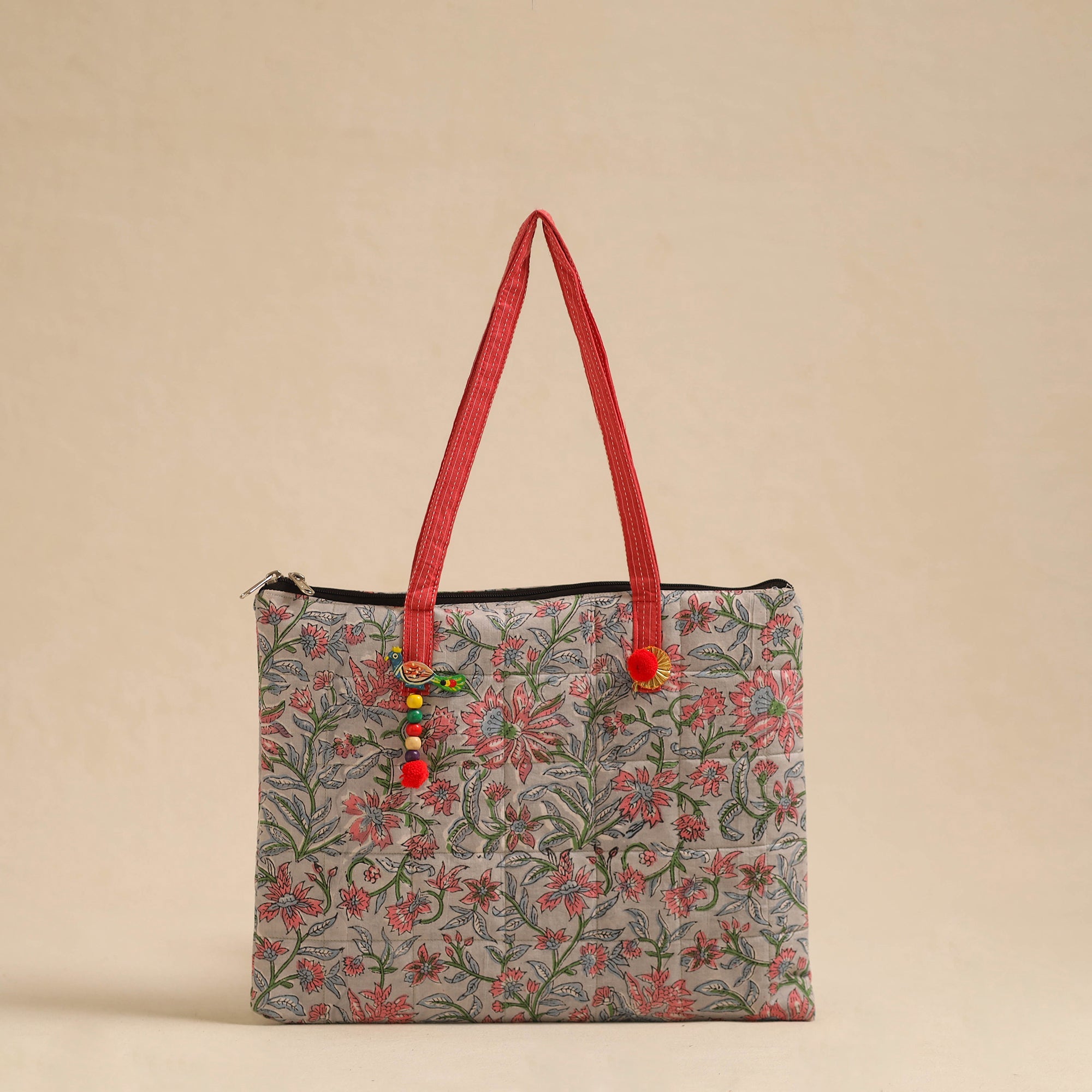 Grey handcrafted quilted cotton hand bag. This hand bag with a zip-lock main closure, providing ample space for your essentials. The foam layer lining ensures durability and protection. Enhance your style with this unique, functional accessory.