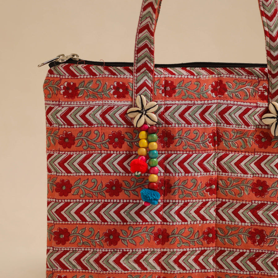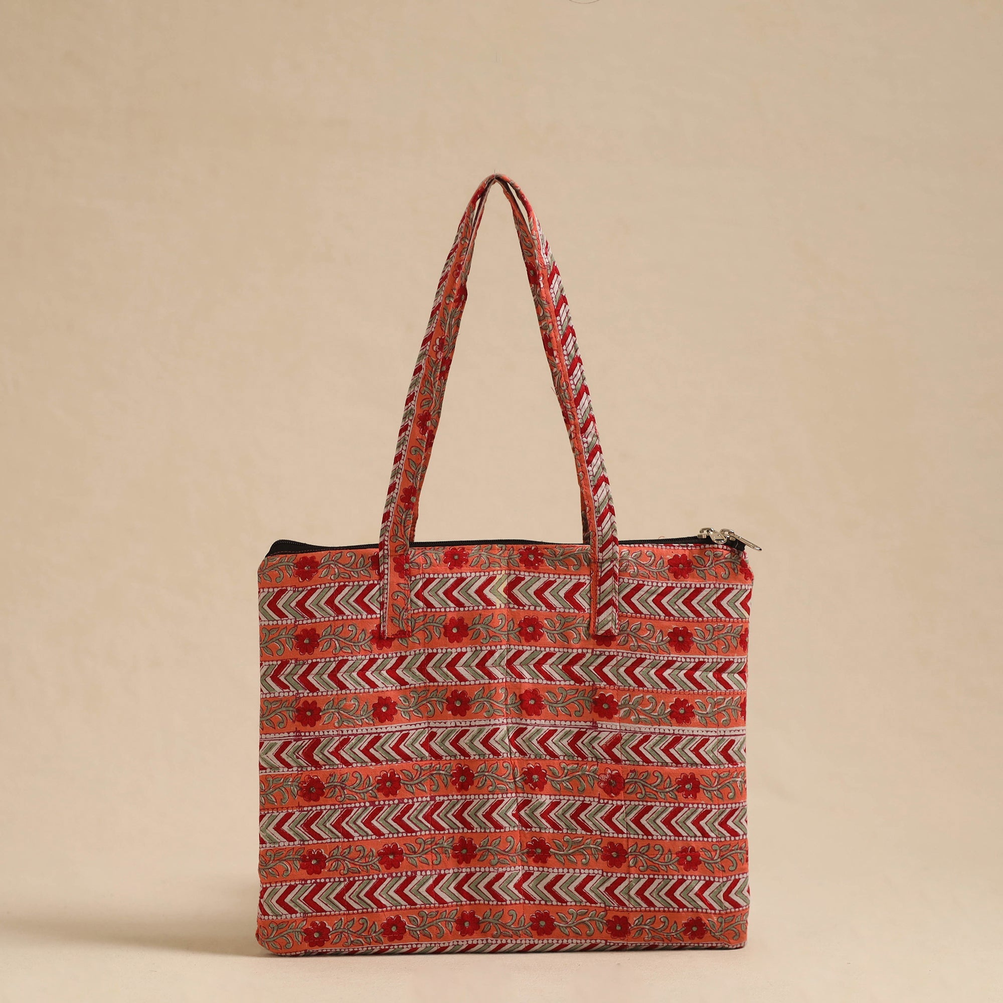 Orange handcrafted quilted cotton hand bag. This hand bag with a zip-lock main closure, providing ample space for your essentials. The foam layer lining ensures durability and protection. Enhance your style with this unique, functional accessory.