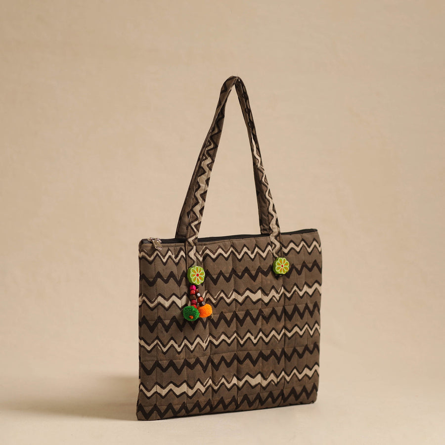 Brown handcrafted quilted cotton hand bag. This hand bag with a zip-lock main closure, providing ample space for your essentials. The foam layer lining ensures durability and protection. Enhance your style with this unique, functional accessory.