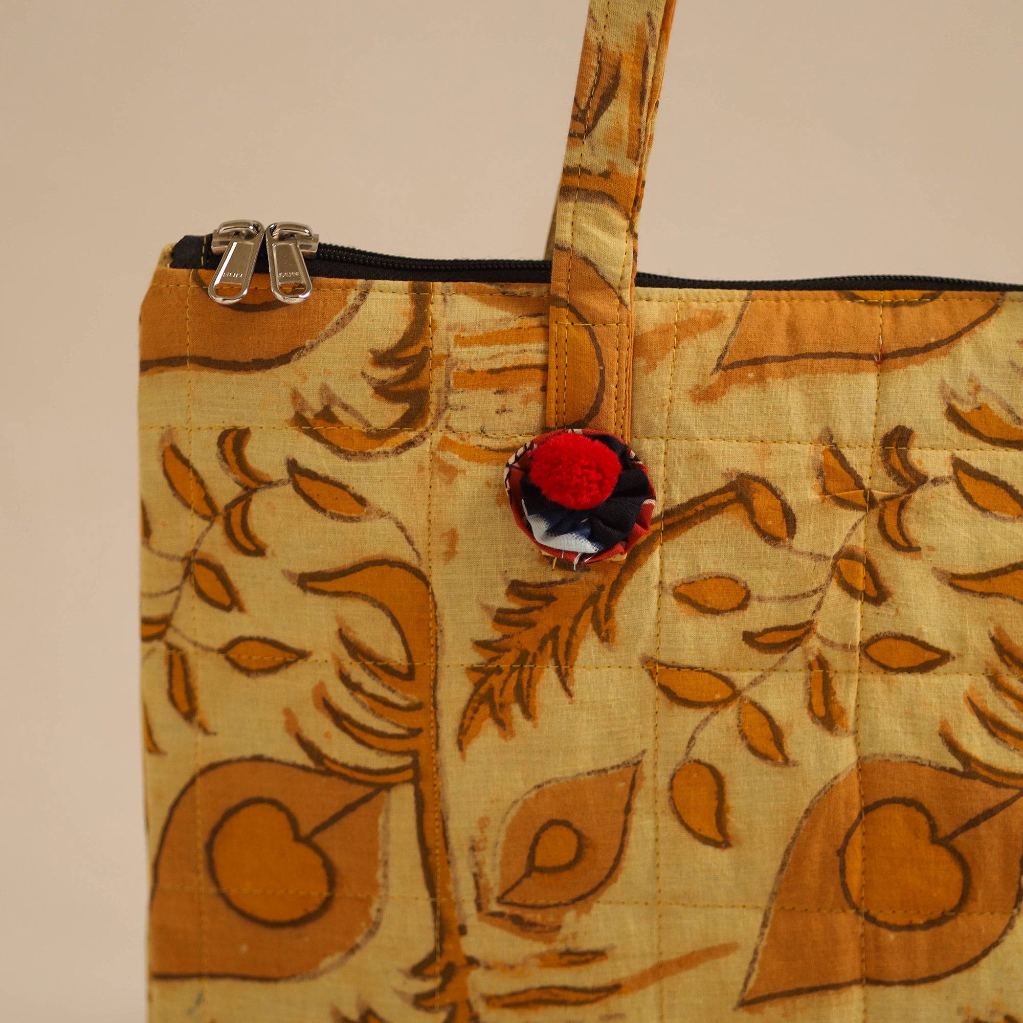 Material Yellow handcrafted quilted cotton hand bag. This hand bag with a zip-lock main closure, providing ample space for your essentials. The foam layer lining ensures durability and protection. Enhance your style with this unique, functional accessory.