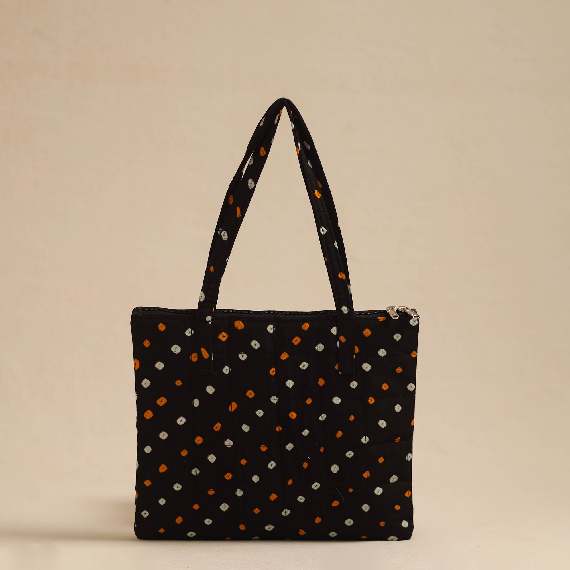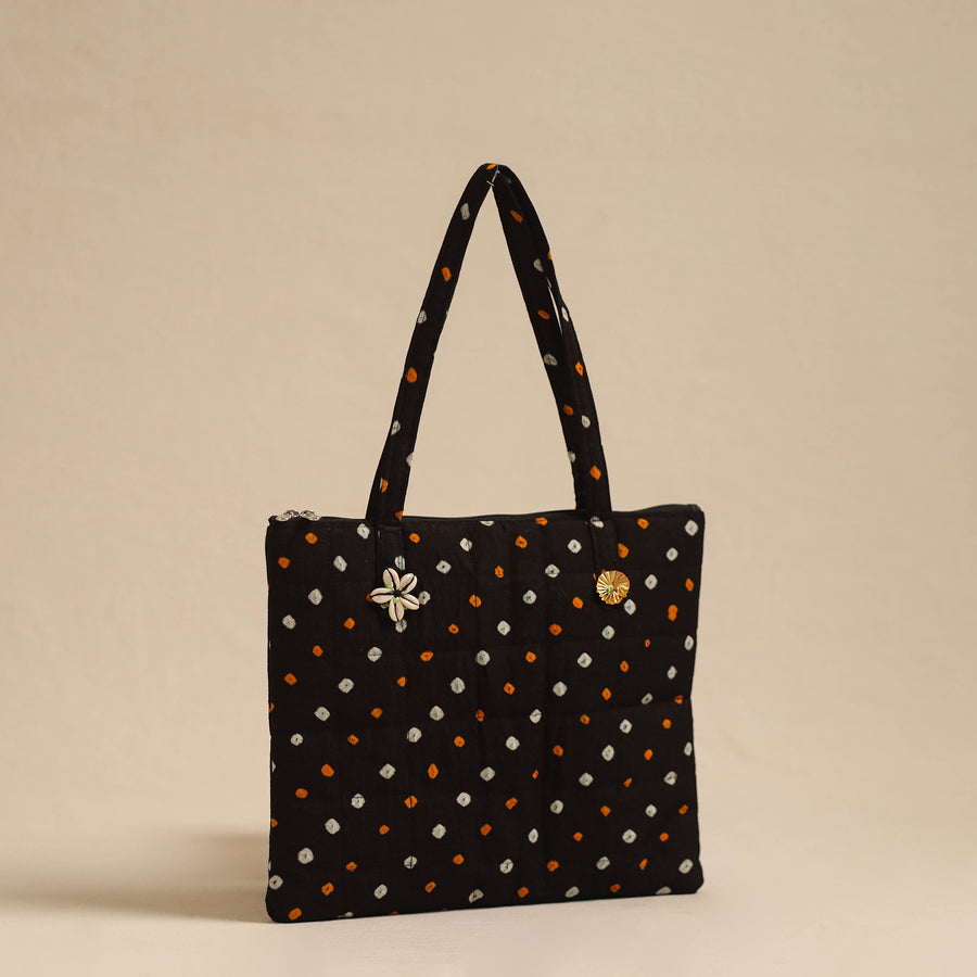 Black handcrafted quilted cotton hand bag. This hand bag with a zip-lock main closure, providing ample space for your essentials. The foam layer lining ensures durability and protection. Enhance your style with this unique, functional accessory.
