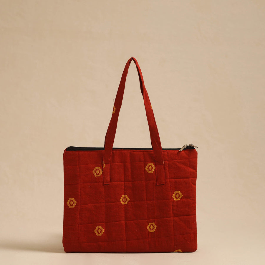 Red handcrafted quilted cotton hand bag. This hand bag with a zip-lock main closure, providing ample space for your essentials. The foam layer lining ensures durability and protection. Enhance your style with this unique, functional accessory.