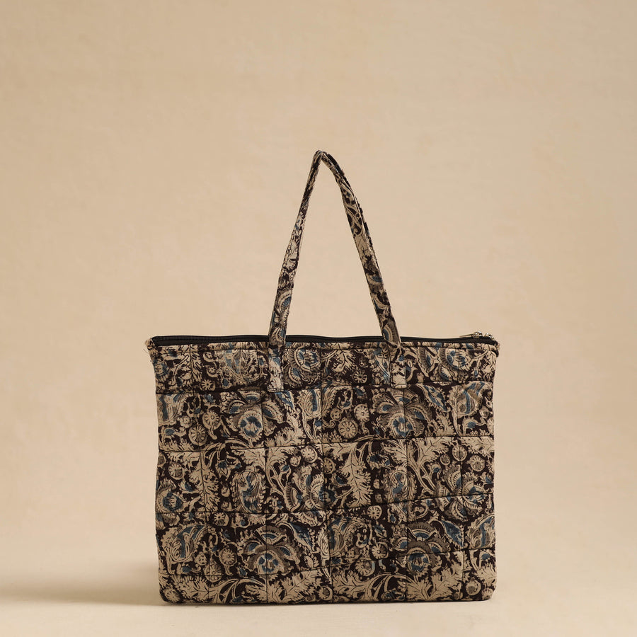 Black handcrafted quilted cotton hand bag. This hand bag with a zip-lock main closure, providing ample space for your essentials. The foam layer lining ensures durability and protection. Enhance your style with this unique, functional accessory.