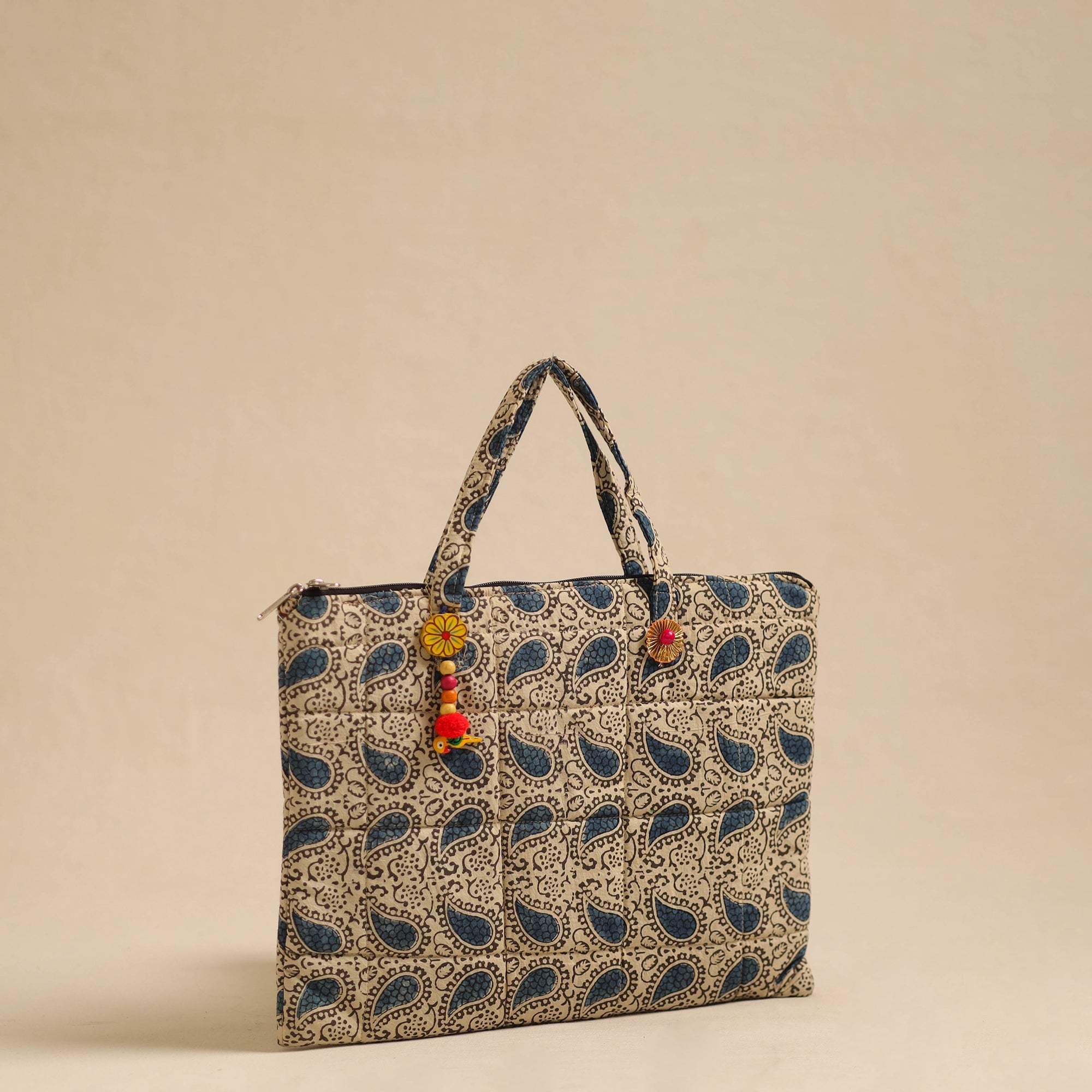 Beige handcrafted quilted cotton hand bag. This hand bag with a zip-lock main closure, providing ample space for your essentials. The foam layer lining ensures durability and protection. Enhance your style with this unique, functional accessory.